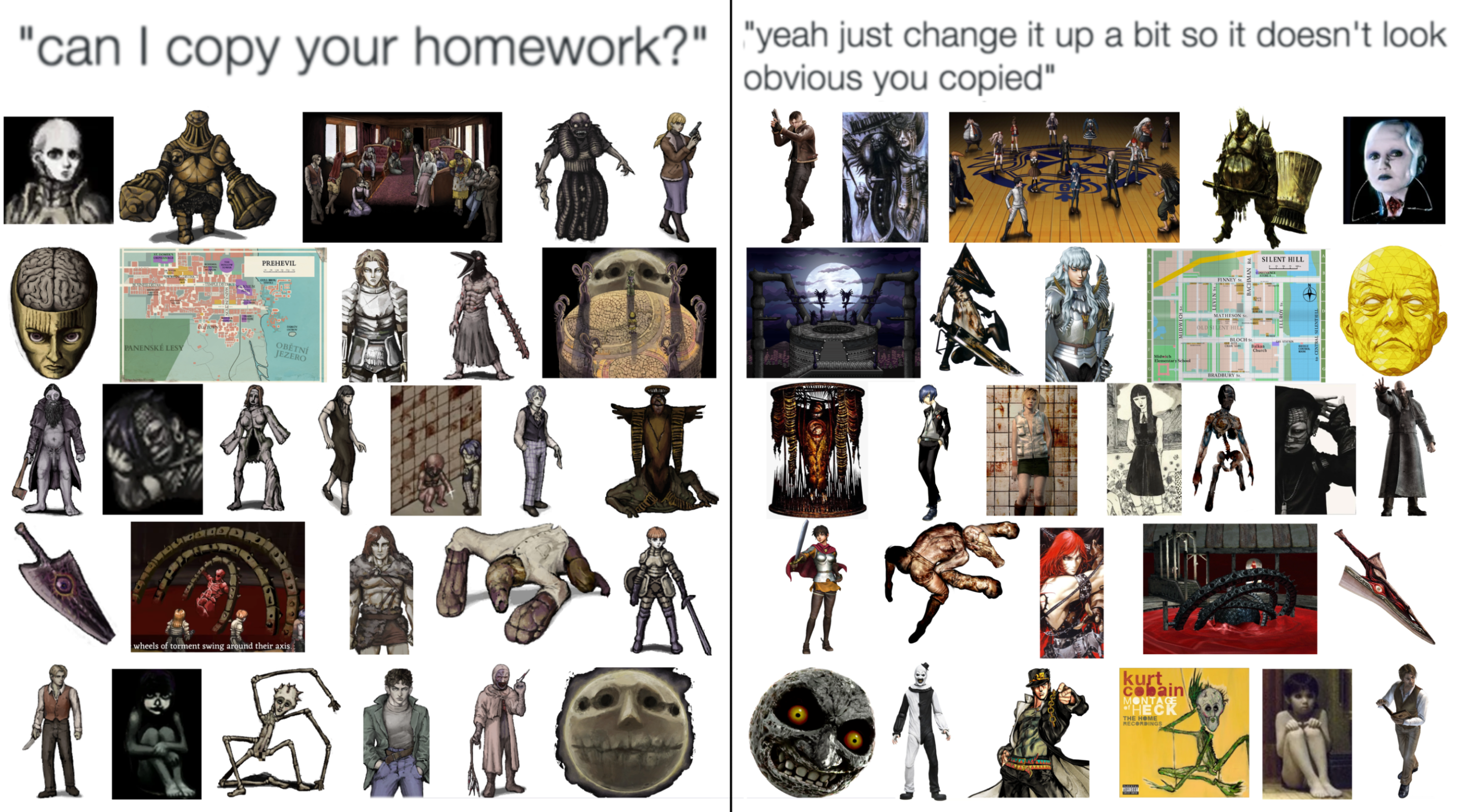 >>735058291some of these are quite a stretch, the only ones that are particularly obvious references are the kurt cobain album cover, needles, and the soul edge, but that kid from the grudge is genuinely traced a little which is weird considering the dude can obviously draw just fine