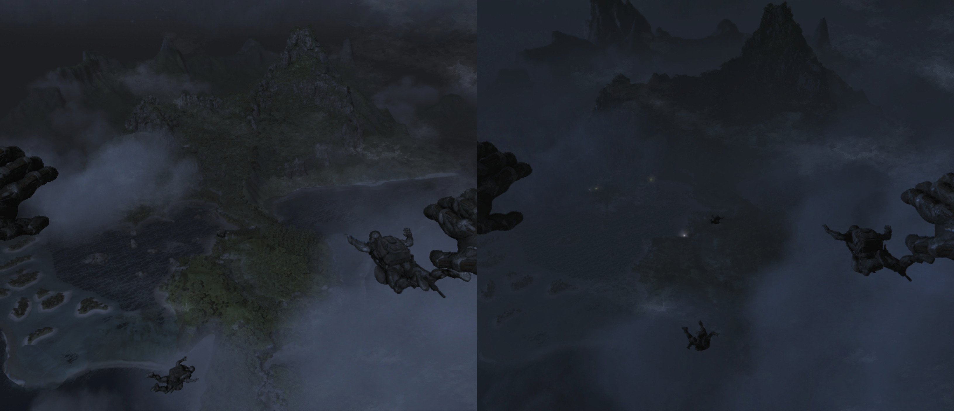 Yay for mods, but the remaster really was kind of an embarrassment, wasn't it? Just look at this. The HALO jump at the start of Crysis is where the game really wows you with its sense of scale and visual composition after the intimate, cramped plane interior. And there are so many problems. The lighting is all wrong. It's way too bright, and it reveals the tiling of the terrain and ocean. The ceph ship is literally missing from the background. The distant lights are missing. It looks like the clouds are missing. A team that understood Crysis would have immediately noticed these things and fixed them. Saber I'm sure are very talented and passionate, but they were so tone deaf art-wise, and clearly didn't know how to make CryEngine look good.