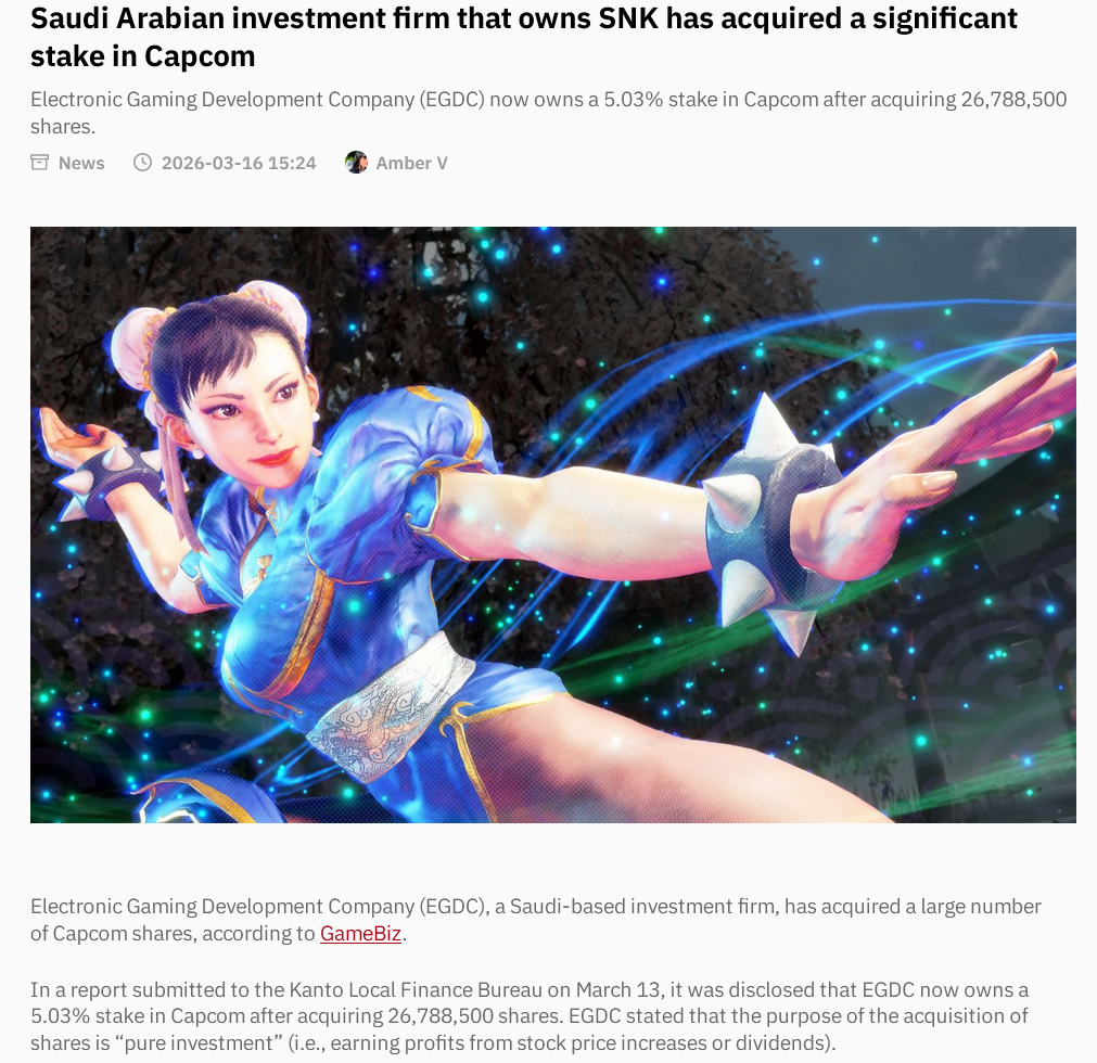 >>735064392There's definitely predatory acquisitions going on (see the FGC) but trying to force ownership of the larger gaming industry isn't going to happen and isn't realistic, it's a repeat of the concern trolling about the Japanese buying out America in the 80sThough I sometimes wonder if some of the concern trolling doesn't come from western AAA companies pissed that Saudi Arabia has little or no interest in them (since they're AAA devs and publishers, so their budgets are ungodly huge and the games they make aren't profitable unless they sell tens of millions of copies and they take so long to make the IP basically undergoes relevancy death during its own development time)