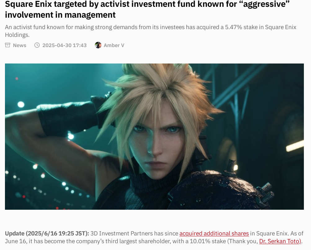 >>735063868>>7350639515% means they can ask questions at shareholder's meetings and basically nothing else. Unless you hit that mythical 51% stake and therefore control the company, it means pretty much nothing. As mentioned by another guy they have an 8% stake in Nintendo, and they're never going to have any administrative sway over Nintendo because that company controls more than enough of its own stock that hostile takeovers are impossible, on top of the fact that if they were ever under serious risk of it, Nintendo would probably douse itself in gasoline and light itself on fire before liquidating everything that's not an IP, which it would take to its grave.