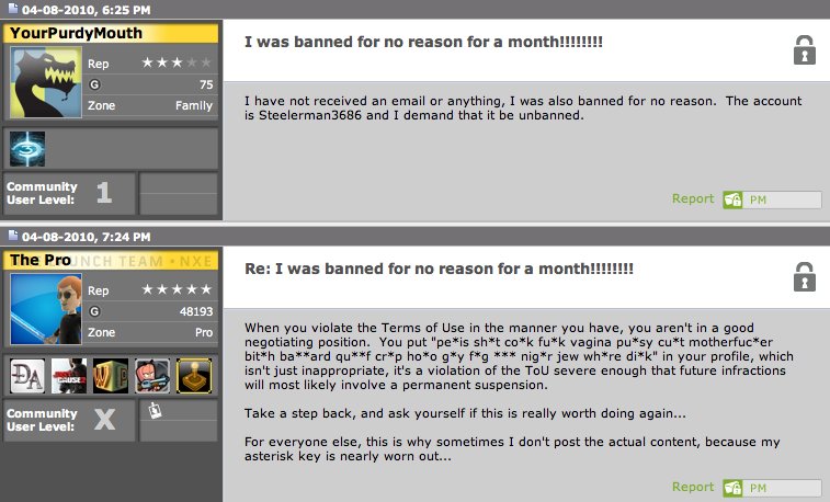>The ProHe is always in the wrongWhen he also went by "The Man" he was just banning anybody with prestige 10 in MW2 for cheating because aparently kids arent allowed to spend all their free time grinding on cod after school