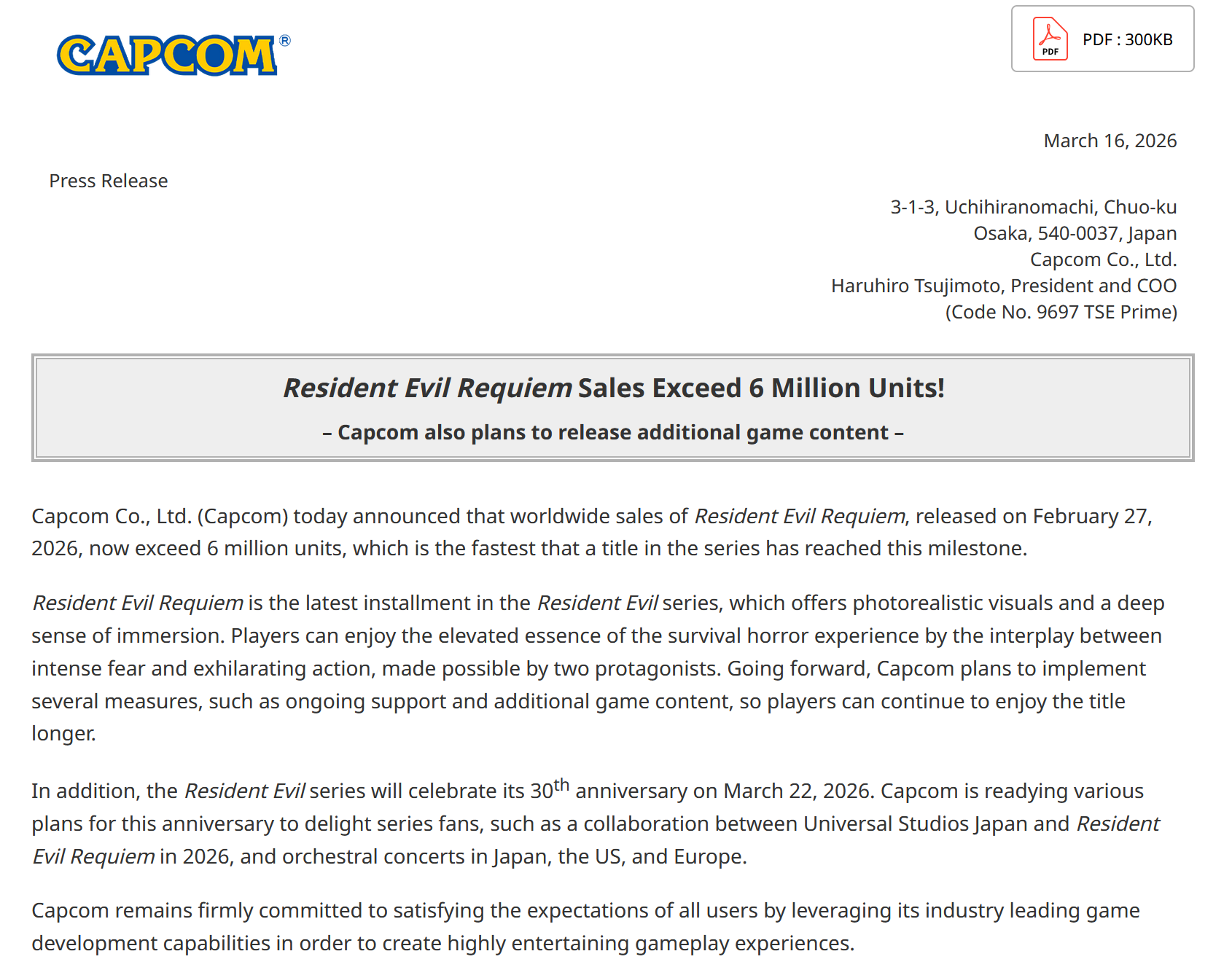 Resident Evil Requiem sold 6 million.Another million in 12 days.https://www.capcom.co.jp/ir/english/news/html/e260316.html