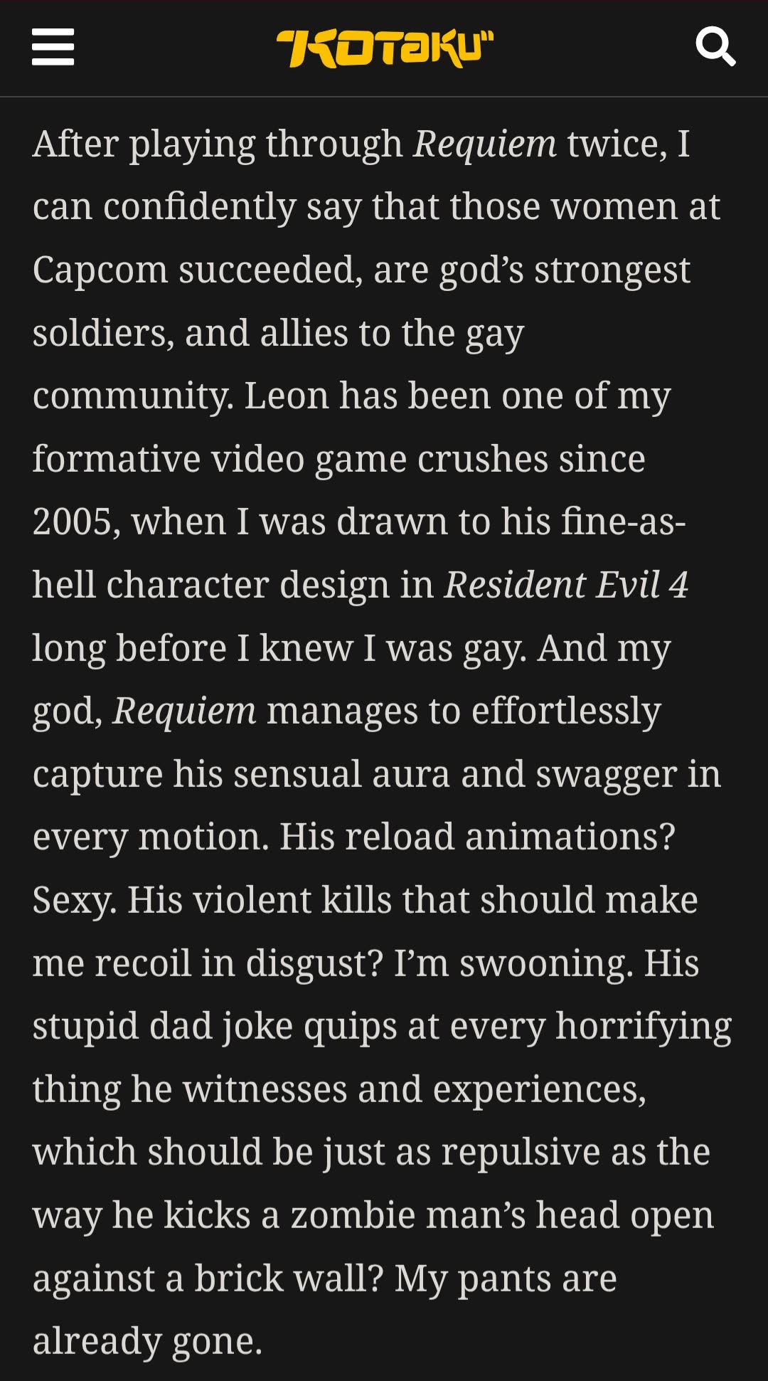>>735074541Ugh what are you talking about chud? No one is stopping you from liking sexy women. Just as long as you don't (proceeds to list everything you like while seeing no hypocrisy in openly lusting for shirtless Leon)