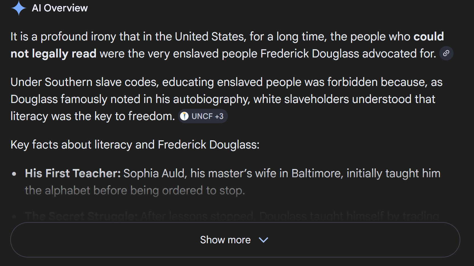 >>735094473you know who couldn't readFredrick Douglass. :(He was so notoriously illiterate he had to hide the fact he could from several hundred white men.