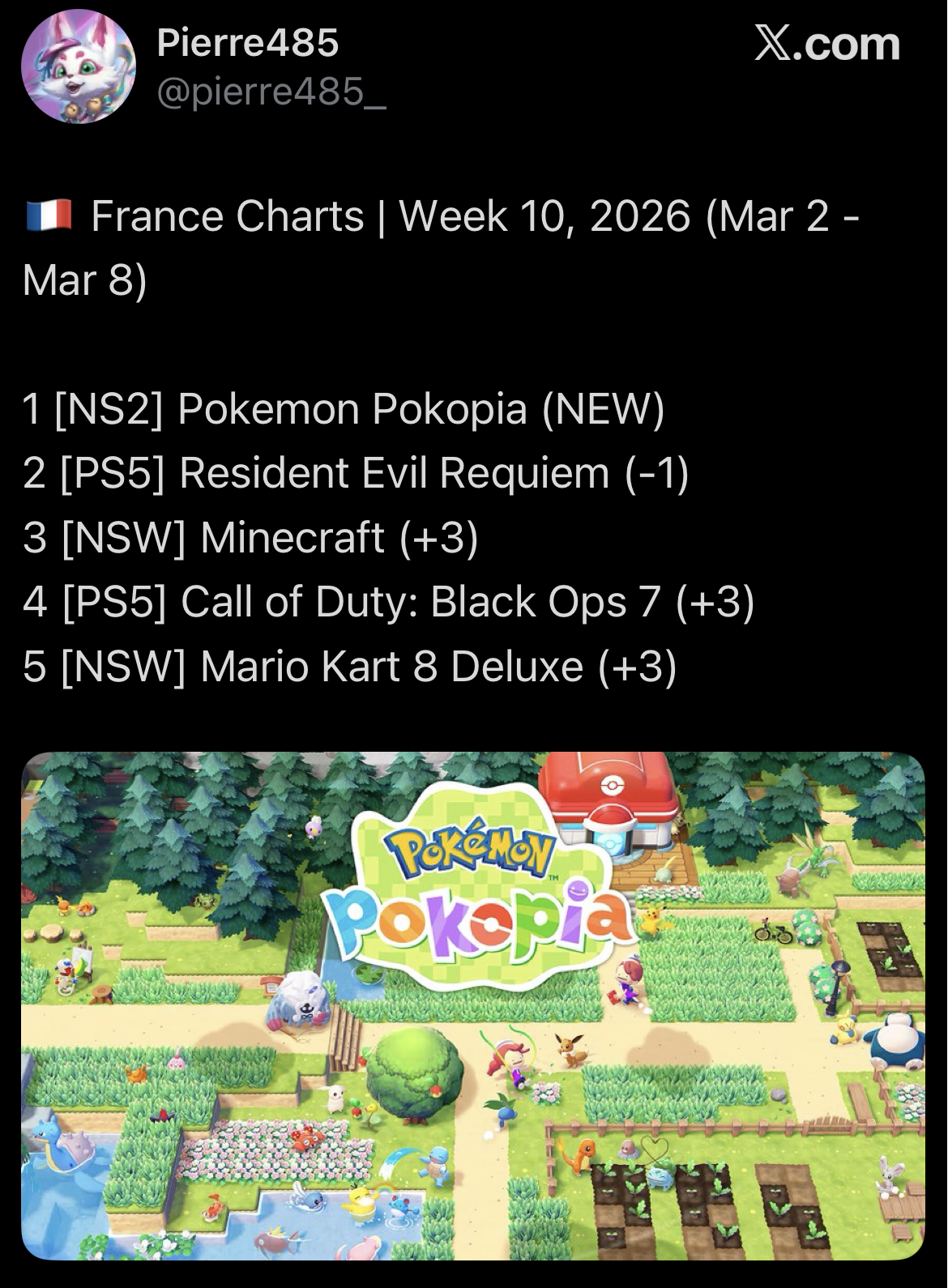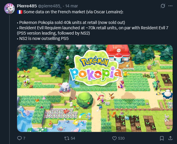 >Top 40 UK Retail Sales Week 11, 2026:01 (01) Resident Evil Requiem - PS5 54%, PC 35%, Switch 2 6%, Xbox 5%02 (03) Mario Kart World03 (NEW) WWE 2K26 - PS5 76%, Xbox Series 16%, Switch 2 8%04 (02) Pokémon Pokopia05 (04) Pokémon Legends: Z-A - Switch 2 53%, Switch 47%06 (NEW) Monster Hunter Stories 3: Twisted Reflection - Switch 2 50%, PS5 45%, Xbox Series 4%07 (05) Resident Evil 7: Biohazard Gold Edition08 (07) Resident Evil 309 (08) Animal Crossing: New Horizons - Switch 69%, Switch 2 31%10 (NEW) Fatal Frame II: Crimson Butterfly Remake - PS5 80%, Switch 2 13%, Xbox Series 7%Top 10 by publisher:Capcom: 4Nintendo: 4Take 2: 1KOEI Tecmo: 1