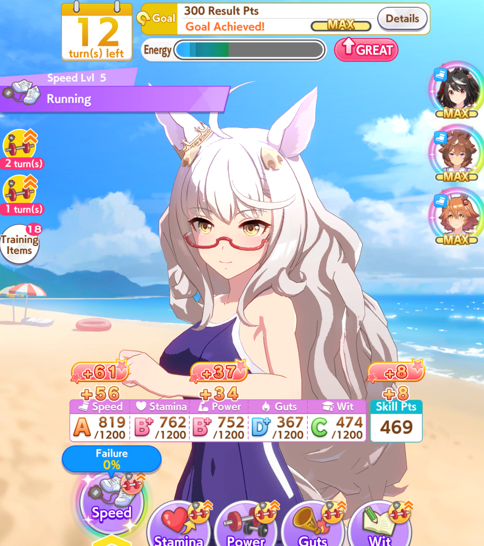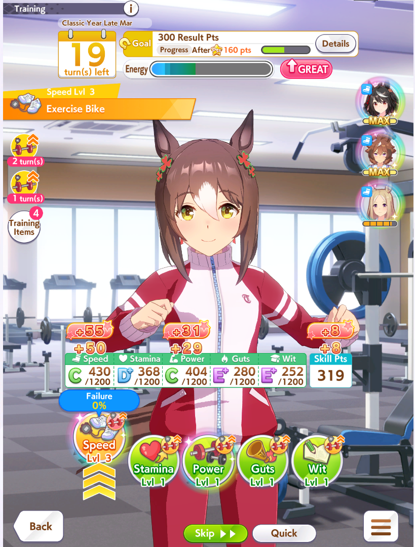 >>735110670I think you are underestimating how good doing races is. MANT is basically shop RNG, you prioritize buying energy recovery items so you can do the good trainings when they appear, you don't need to save them all for summer.Also more races means you will have a lot of scrolls and books, the +15 ones are really good, it's basically like clicking a single rainbow because you also raced that turn.