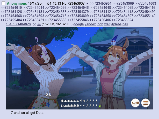 >>735090858>>735086234reminds me of a week or two ago, we had an "Easter Egg" threadTurns out it was just to be a uma musume thread, with anons migrating from the last stealth uma thread