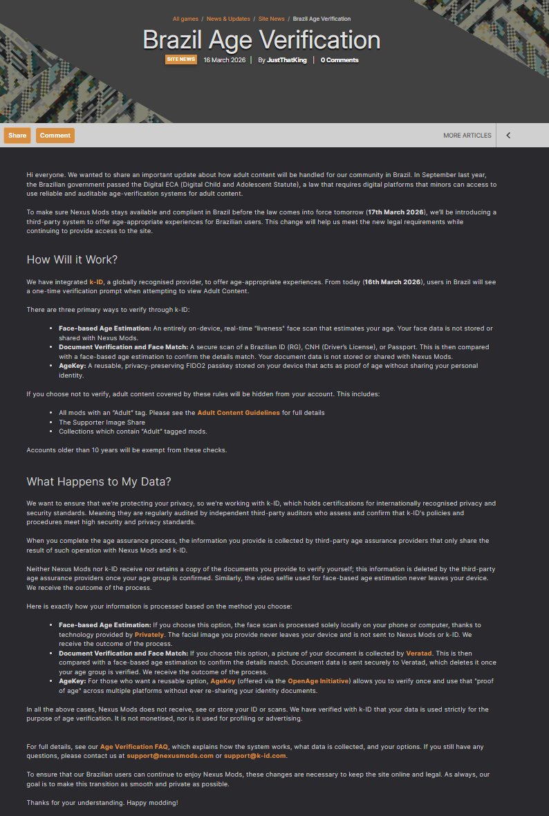 >>735089185As a BR, I would 100% prefer a geoblock from these platforms than this. Make me to use a VPN and force normalfags to realize what's happening. But Nexus clearly wouldn't do that, they just wanted an excuse to implement their system. Literally no one else is doing it.