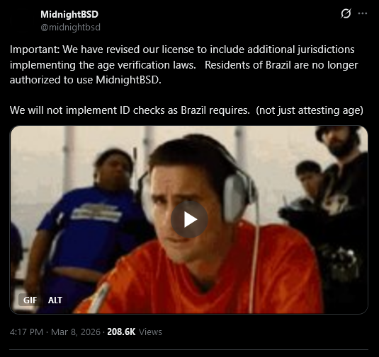 >>735089614This kind of shit is basically impossible to enforce on Linux because you can simply remove the verification shit, recompile the kernel, and upload that version online for anyone to use.Which is probably what a lot of these distros will start doing, where they offer a "verification required" download for places like the UK, Brazil, and California, and a regular download for anyone else.