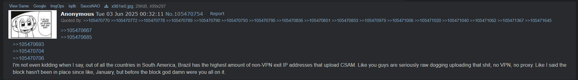 >>735088916I wonder if Brazil will pull a UK on 4chan or go all-in and just ban the site at an ISP level like Australia did to 8moe.That would be kinda funny.