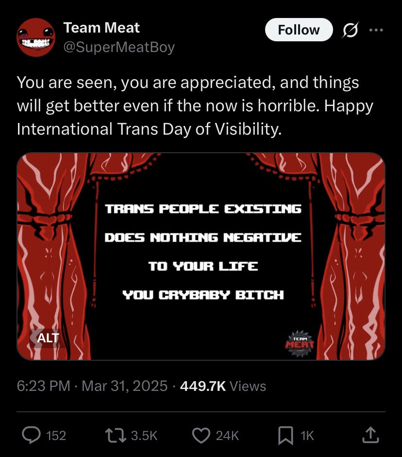 people speaking about "Team Meat" like it's some big faceless corporation but before like 2017 it was literally just Edmund McMileln and Tommy Refenesswap in his name for any mentions of "Team Meat" because that's really what it is