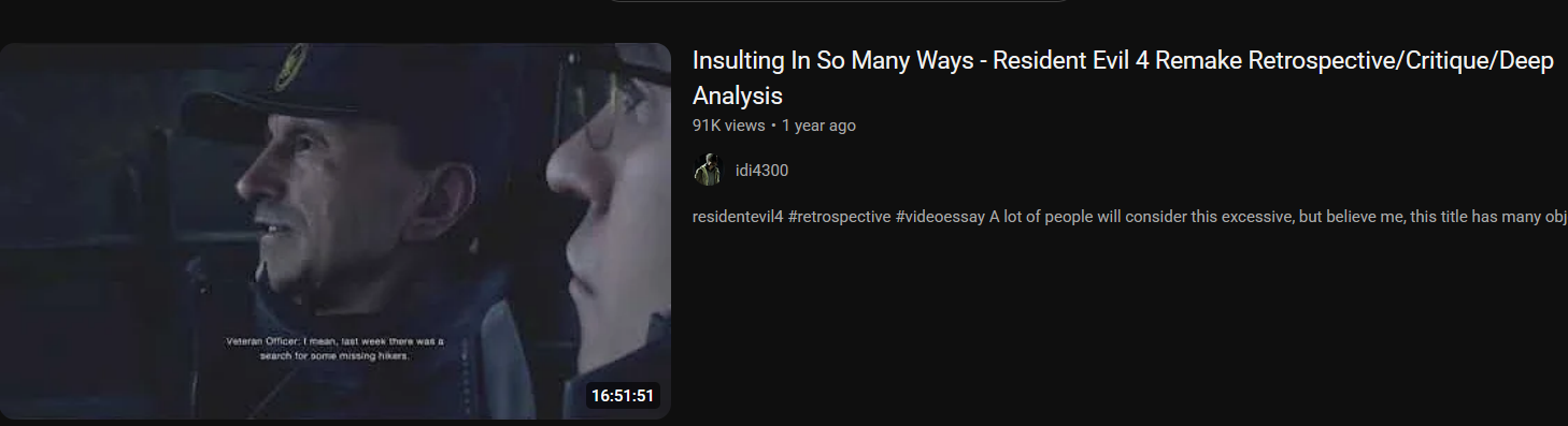 >>735108696I decided the game was bad when they made ashley's design shittier, I have not consumed any type of youtube slop content to reach that conclusion.