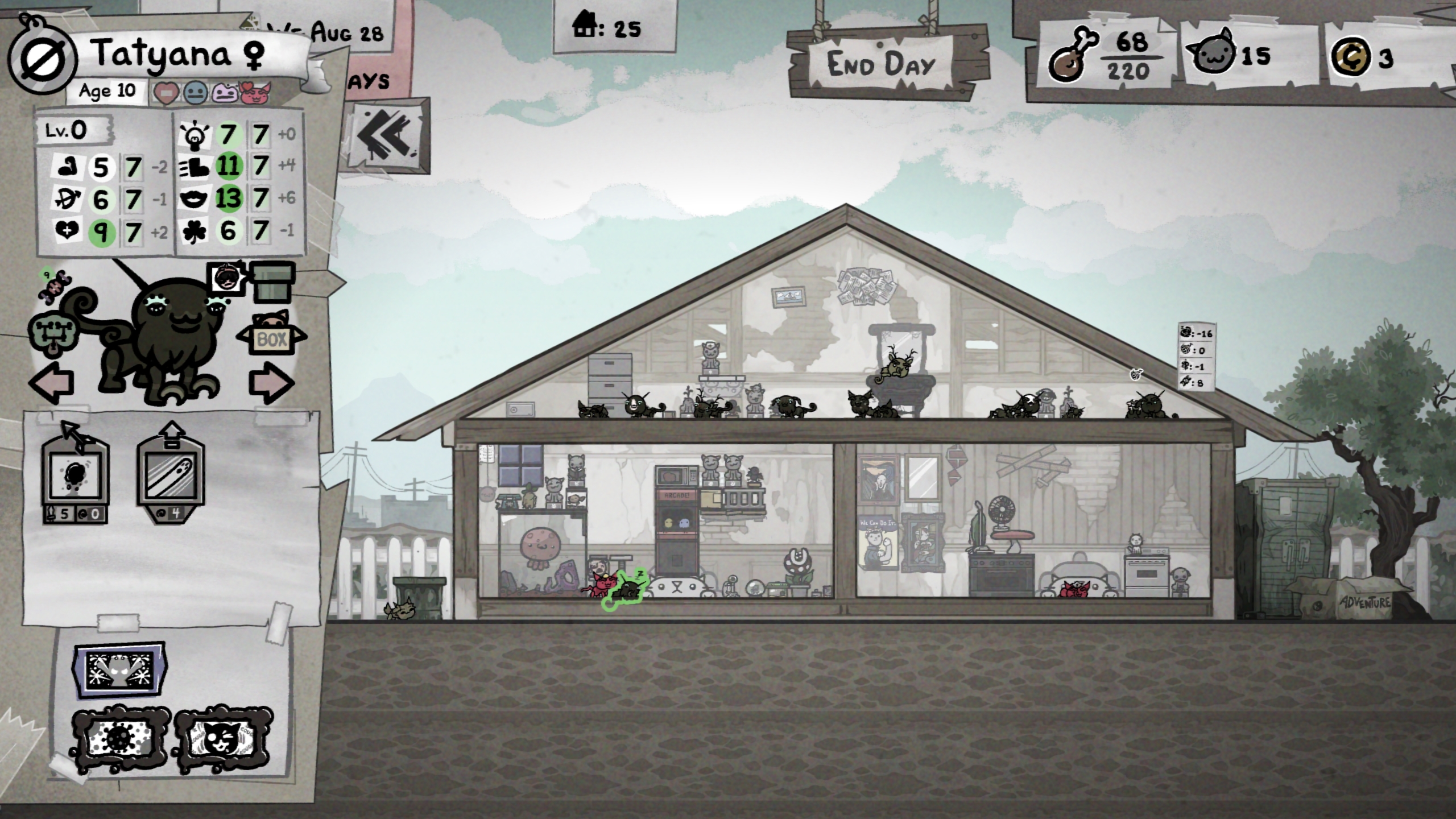 >>735128163base stats only go to 7they can go higher via mutations but there is a limit a fight pit is limitless free stat boosts - provided that they stay alive long enoughwith the chaos idol the stat rewards from winning go from +1 to +2 so they quickly start stacking upa broken paw giving -1 str means fuck all if he wins the next fight giving him +2 backeven better if you have health items in there it could even fix the paw so that's a +3and they keep stackingalso lets you farm dead cats and injured cats for house upgrades, stops breeding cuz of the negative comfort and is all in all a great way to solve the exponential exploding kitten populationthrow some mutation items in there as well fuck it, let the freak show truly thrive