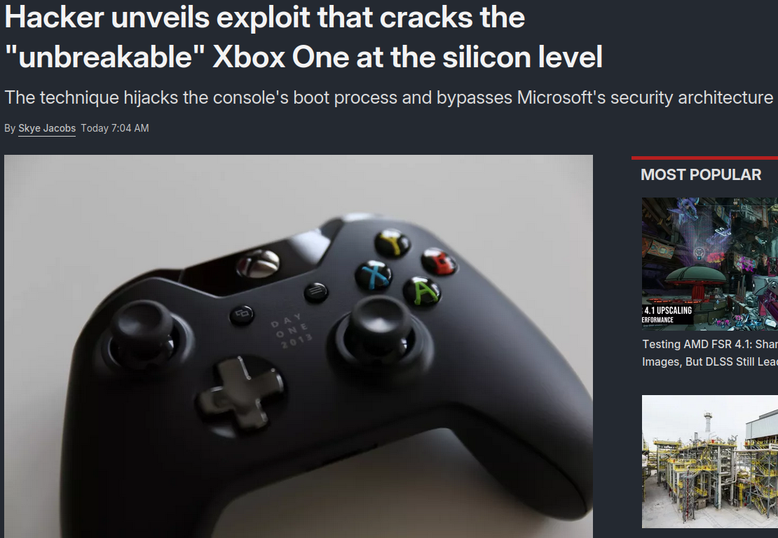 XBROS GET IN HERE : >Hacker unveils exploit that cracks the "unbreakable" Xbox One at the silicon levelhttps://www.techspot.com/news/111692-hacker-unveils-exploit-cracks-unbreakable-xbox-one-silicon.html