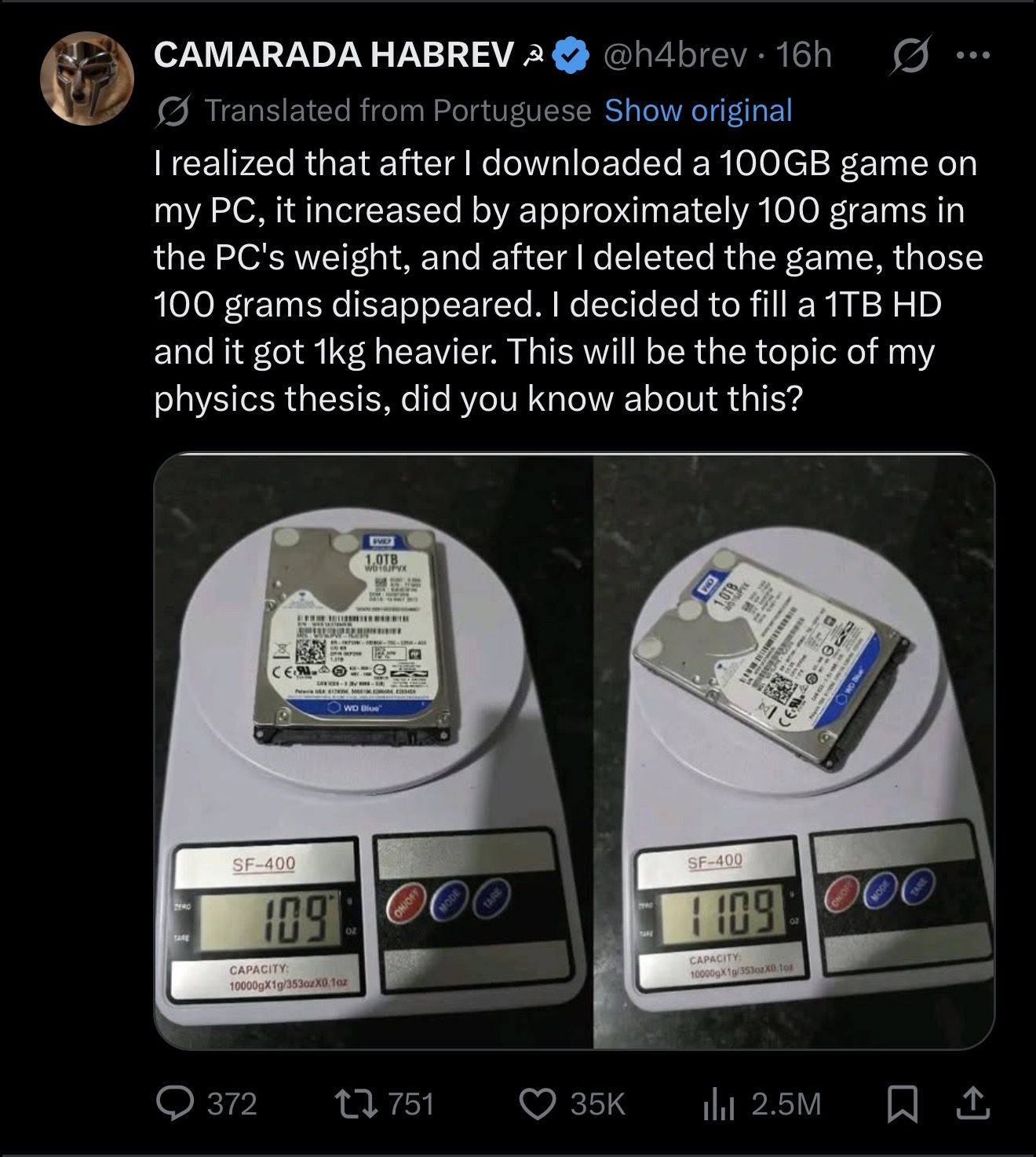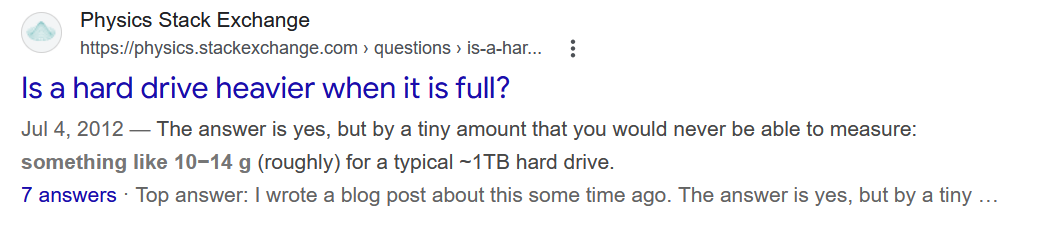 >>735127416Yeah, this dude is right. A drive full of 0s and a drive full of 1s will weigh differently, neither are data.