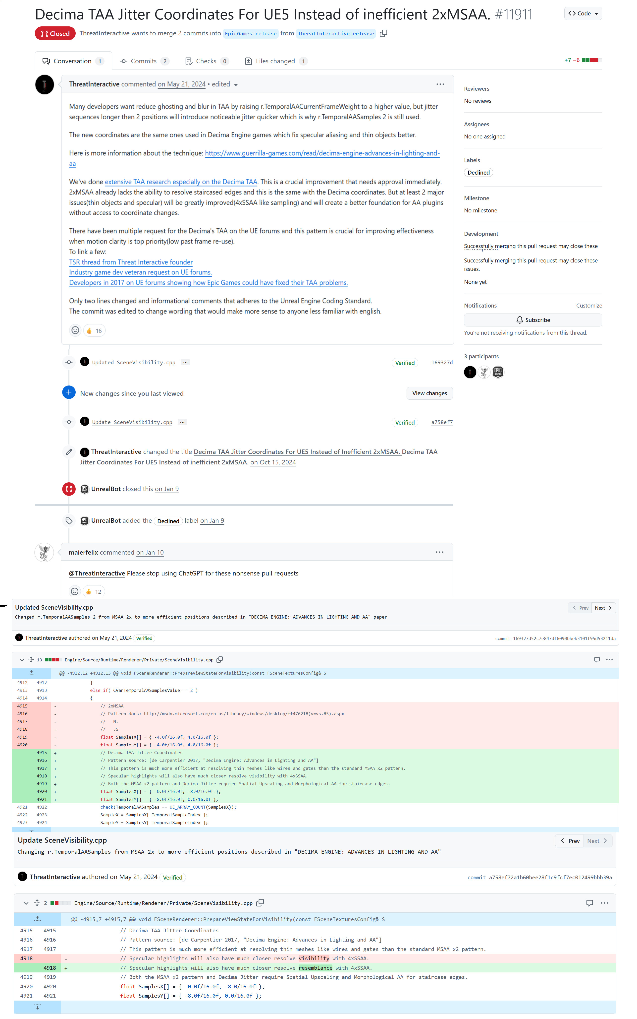 >>735144738He submitted a pull request to unreal engine (effectively, asking Epic to implement his code change for future versions of Unreal Engine), claiming it'll drastically improve TAA, which amounts to just changing a few static number values. I'm not enough in the weeds of graphics programming, nor do I know enough Unreal Engine code to understand what those number changes would exactly entail, but the guy claims the numbers are sourced from another engine (Decima, used by Horizon and Death Stranding games). Even if those minute changes actually improve things (I haven't seen any comparisons), there might be questions about copying competitor's engine just like that.Also, lines starting with // are just comments (ignored by a compiler), so the second code change was just fixing a typo in a comment.