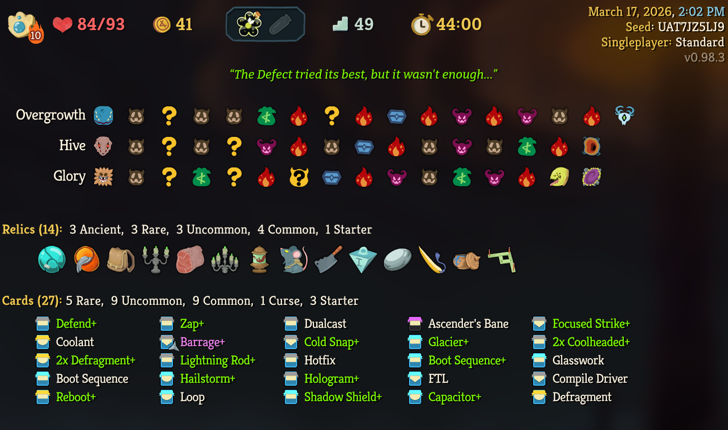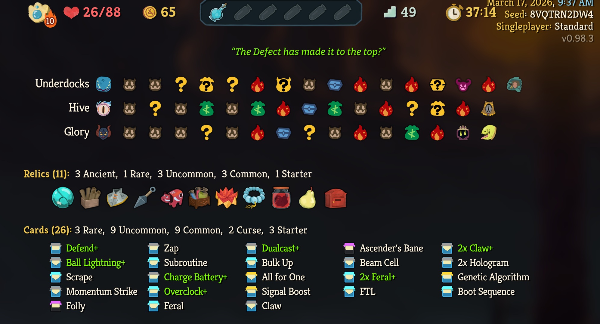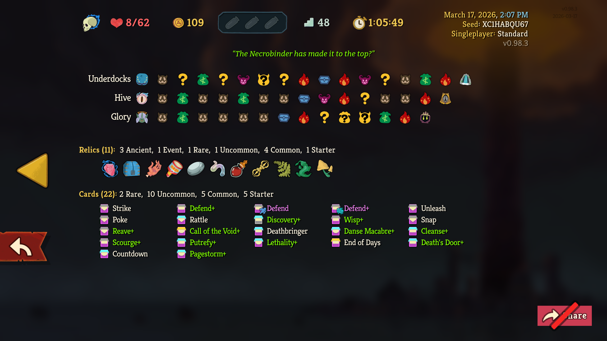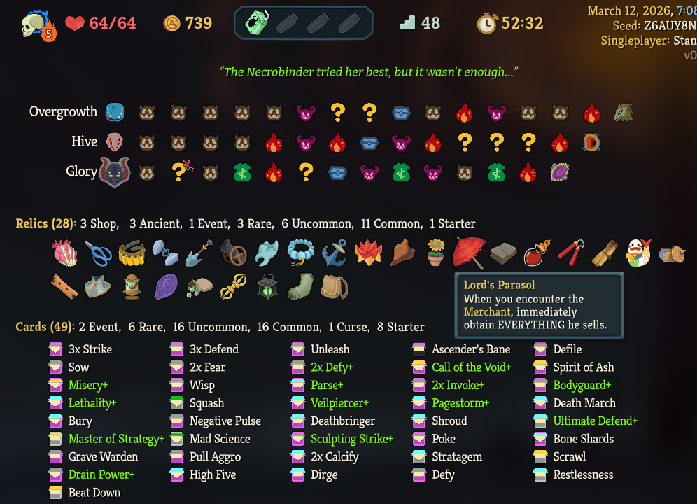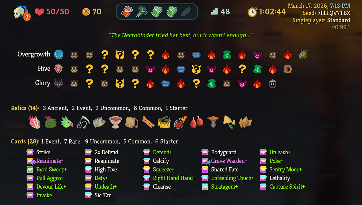 >>735176160good run, necro more survivable than it seems, had crap luck in early cards but still made it work, souls were clutch it seems