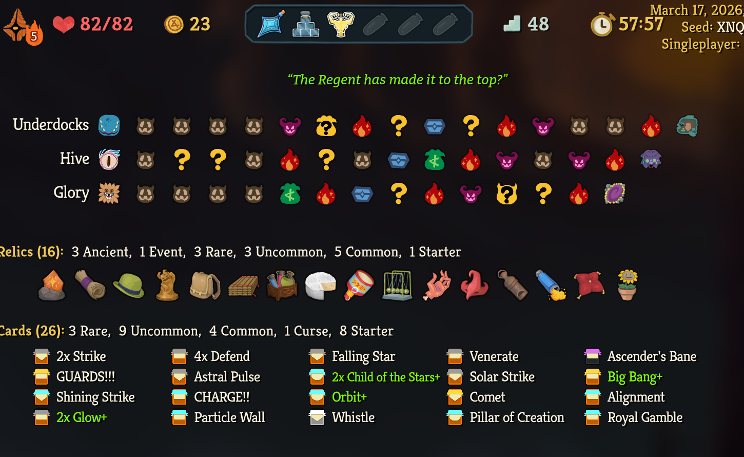 >first time playing regent>get the godrun with op as fuck relics>clear everything easily>think im the regent god>play for hours last night>only beat the act 1 boss once