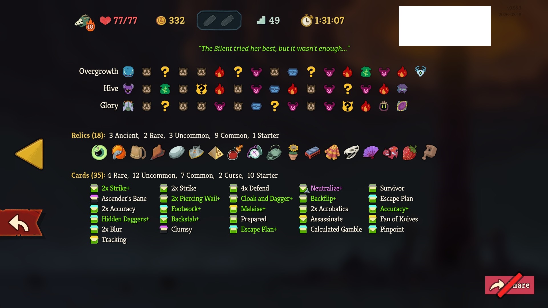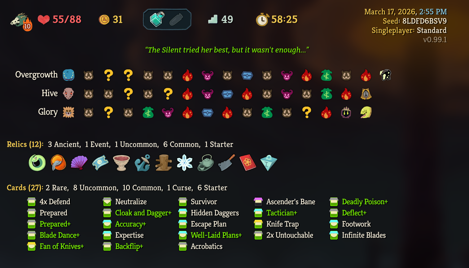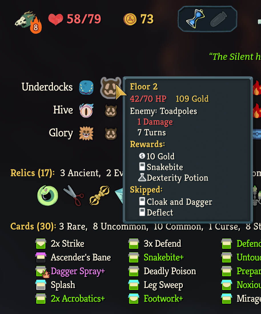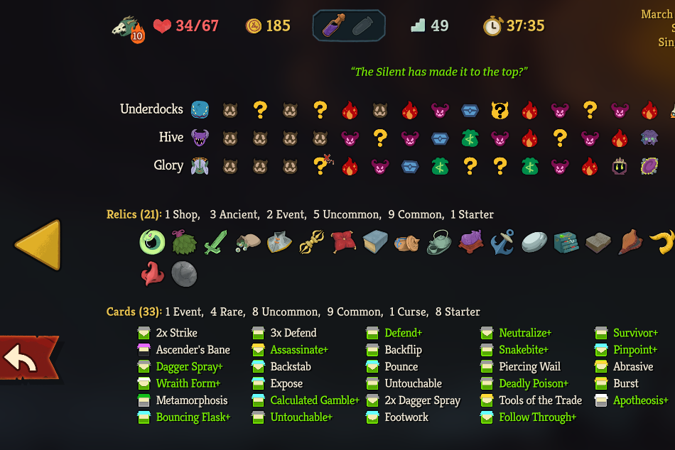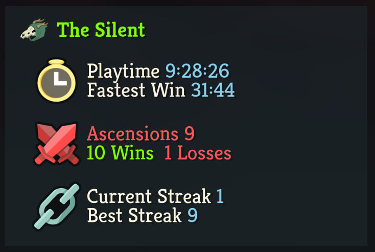 https://www.youtube.com/watch?v=ZUuQWVS3PQ0Made another showcase of how utterly brainless Sly is even when you have a mediocre deck. I honestly feel like it might be impossible to lose on A10 as Silent if you don't make any major mistakes