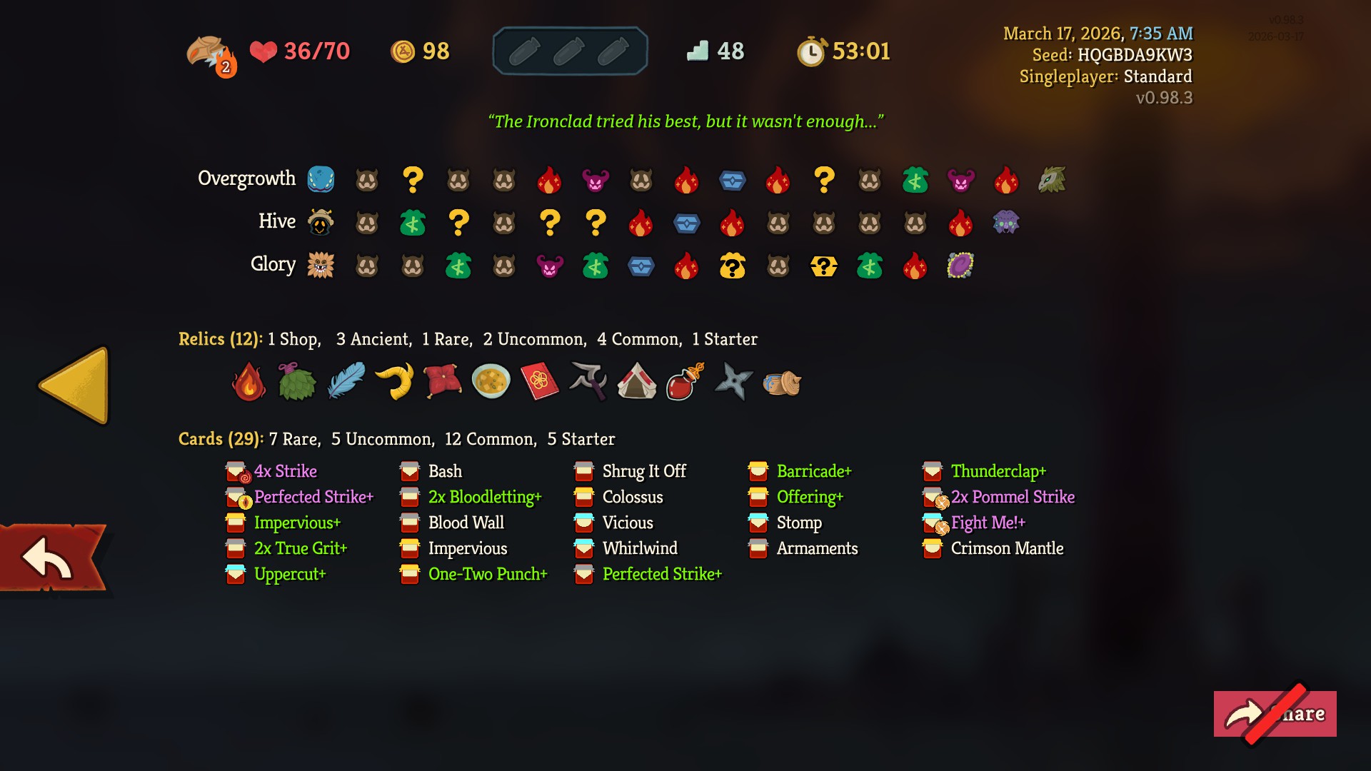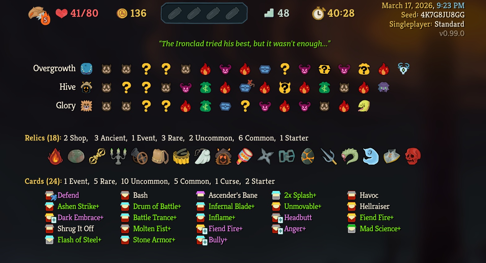 This was the Platonic ideal of a "vanilla" Ironclad run>only exhaust was true grit and the +40 block cards>no exhaust synergies>no expect a fight+>only card draw was pommel strike, shrug it off, vicious, and offering+>never found a single body slam card despite having barricade and 2 impervious+>most generic relics imaginable>act 1 was all about perfected strike>act 2 enchanted my starting strikes>act 3 enchanted my pommel strikesStrike, strike, and strike some more. Offering+ was the only dishonest thing about this run.