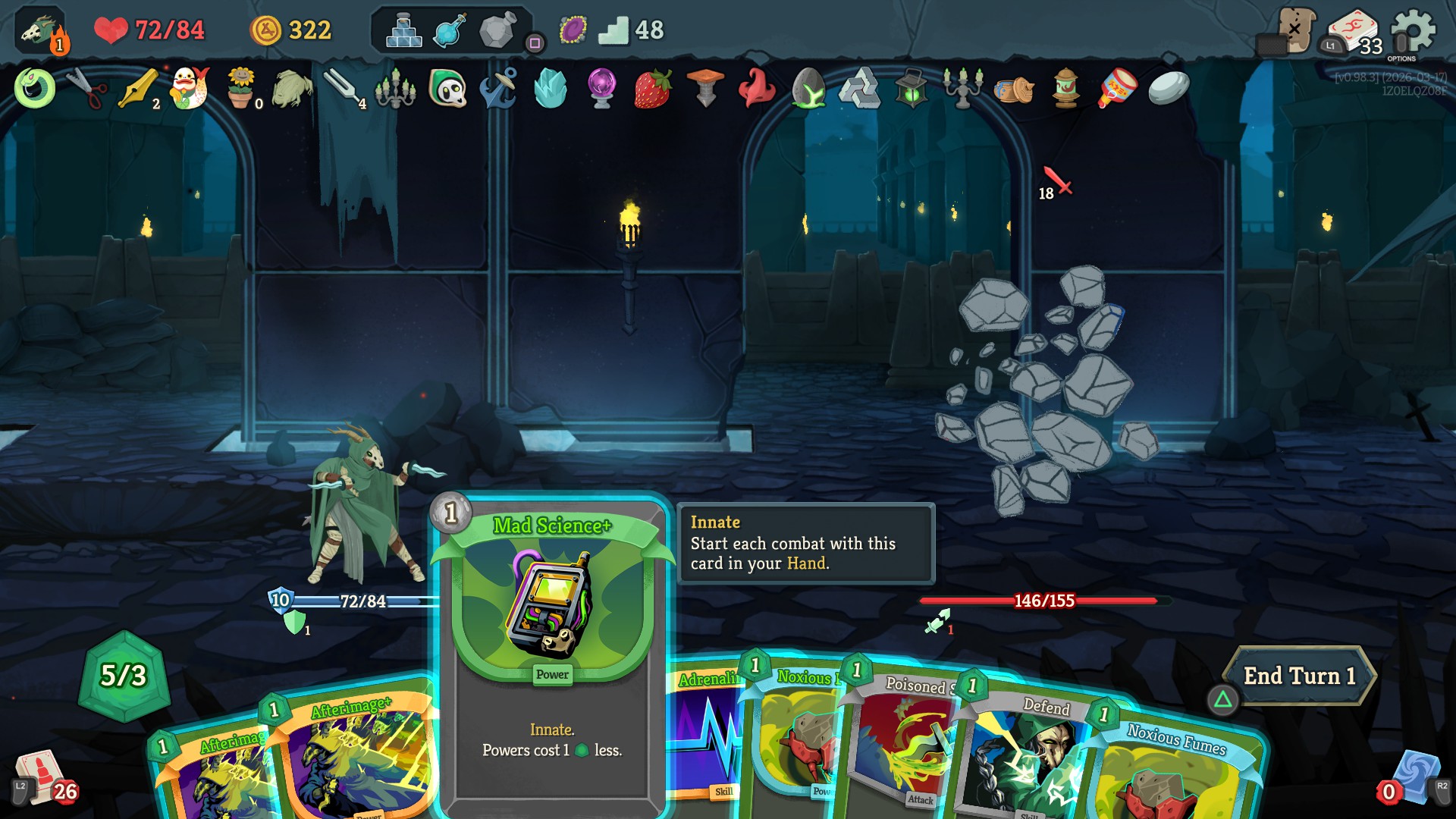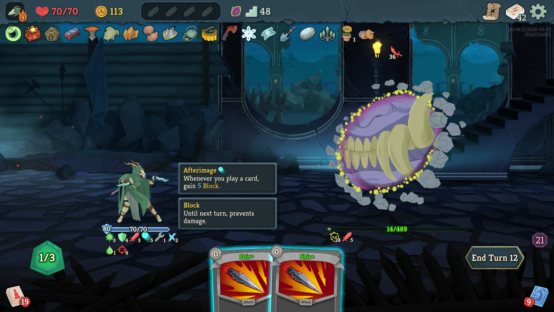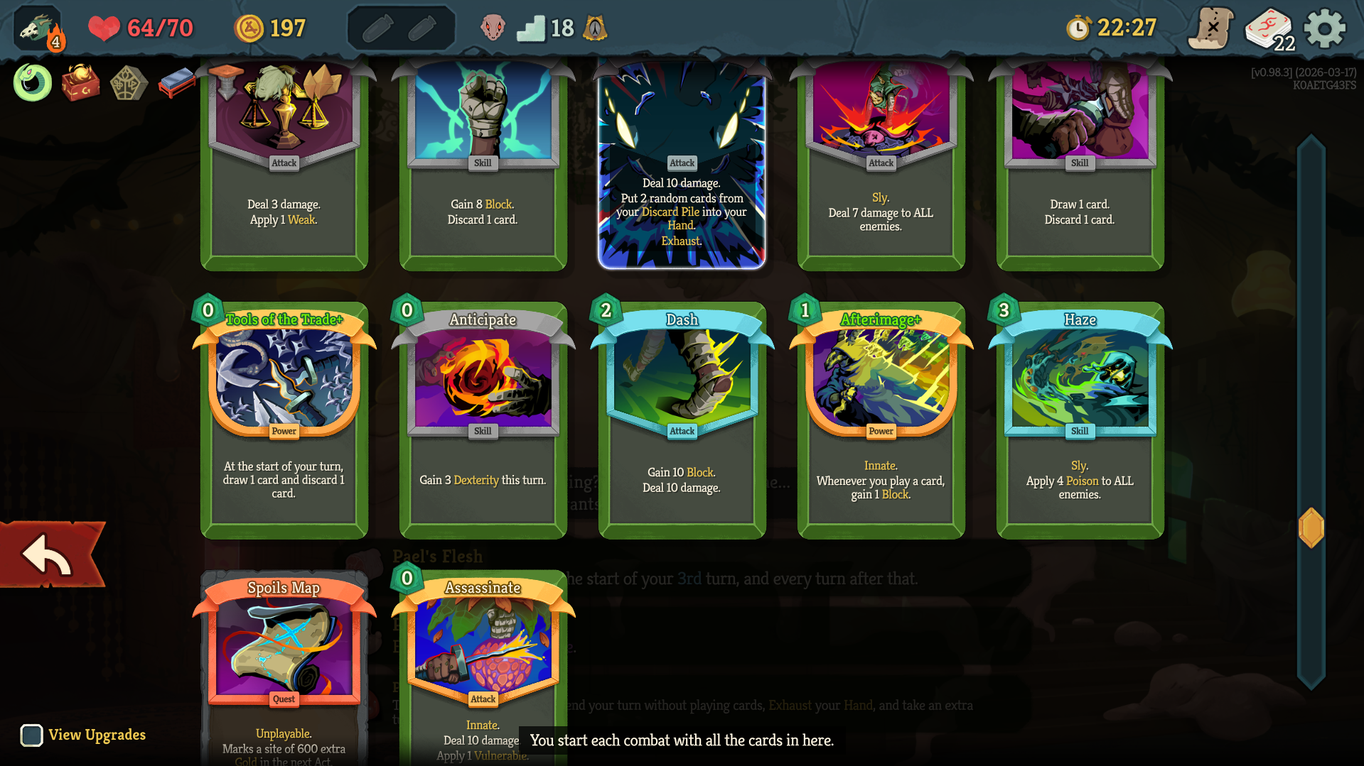 What a concise, compact and deliberate deck.The entire win condition was playing as many sleight of fleshes as possible, then stacking replay on my one (1) copy of fear+ as many times as possible with Transfigure, making it cost 0 with veilpiercer and dealing 200 damage at once.Really strong cycling power.and ability to pivot with utilities discovering random cards.This was on A9.