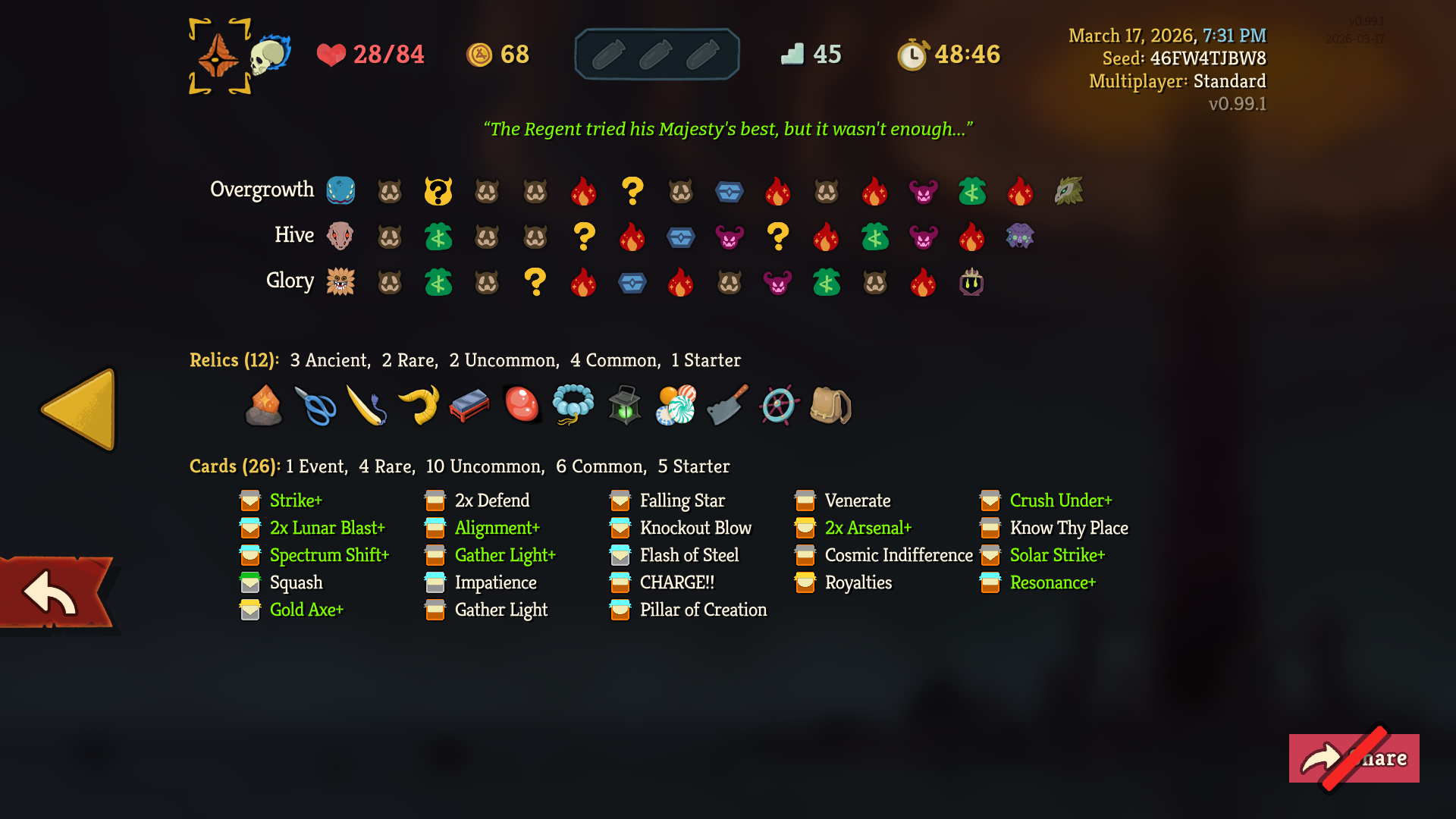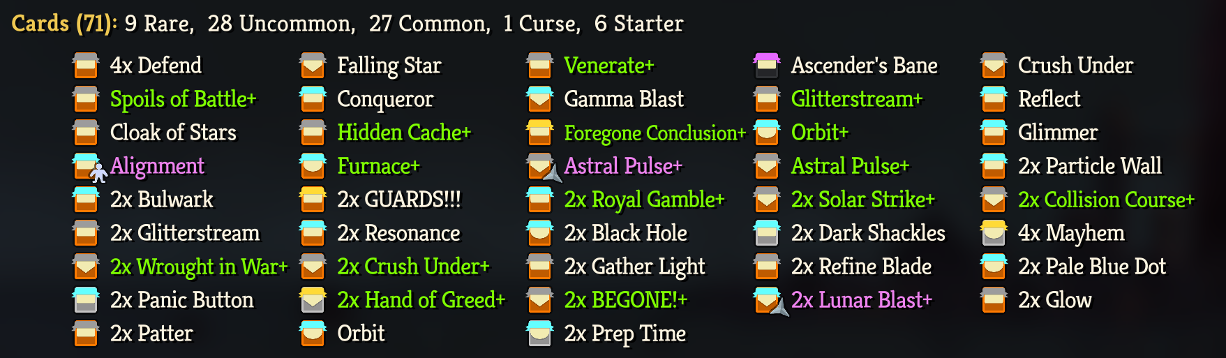 >>735178613And here's the deck I hadGolden Axe was a mistake because I wasn't using enough cards even though I was doing a lot with what I hadImpatience became a liability because I had too many unnecessary attacks like Solar Strike+ or even that Knockout Blow occupying space in my hands and preventing me from using ImpatienceCrush Under was huge value in the early-mid game thanks to the strength loss on the mobs. We'd get wrecked by the multihits and stuff if I hadn't had that to tide us through Act 1 and most of Act 2. Resonance I got later but I don't think it mattered much compared to the MVP of 2 Arsenal+ fuelling strength into Lunar Blast+Gather Light I honestly only had for the block, and all the stars mattered for was spending on Alignment and the occasional Falling Star for Weak+Vuln which got less and less important as the run went on as you saw.Royalties I only got at the start of Act 3 so I could get a few gold on the way to the shop, that's it. Too late to honestly matter for anything>>735178878Yeah it wasn't a star abuse run with Radiance. It wasn't a Forge run. It wasn't a strictly exhaust card run. It wasn't a multihit abuse with Seven Stars or even Stardust run either. This was simply colorless gen with 2 Arsenal+ and spamming enough skills to make Lunar Blast delete things