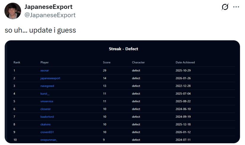 Anyone know this JapExport guy? He claims to be in top 5 Spire 1 players but I've been following the records for a few years and I don't think he held any, and even Baalor who isn't close to the top 5 held a rotating streak record for a good while.