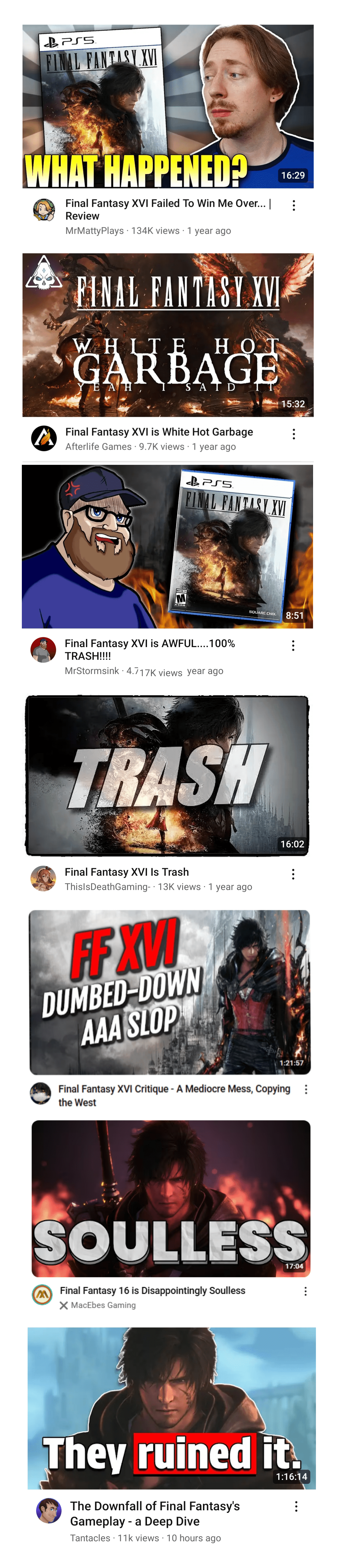 >>735156449>gobbling up the youtube fecal matteryour brain is tainted, your mind is no longer your own, you are a contrarian driven by other contrarians who feed on your desire to find solidarity in being contrarian. when did you last find something genuinely fun, without being told to?ff16 is not perfect, but it is a very good video game.
