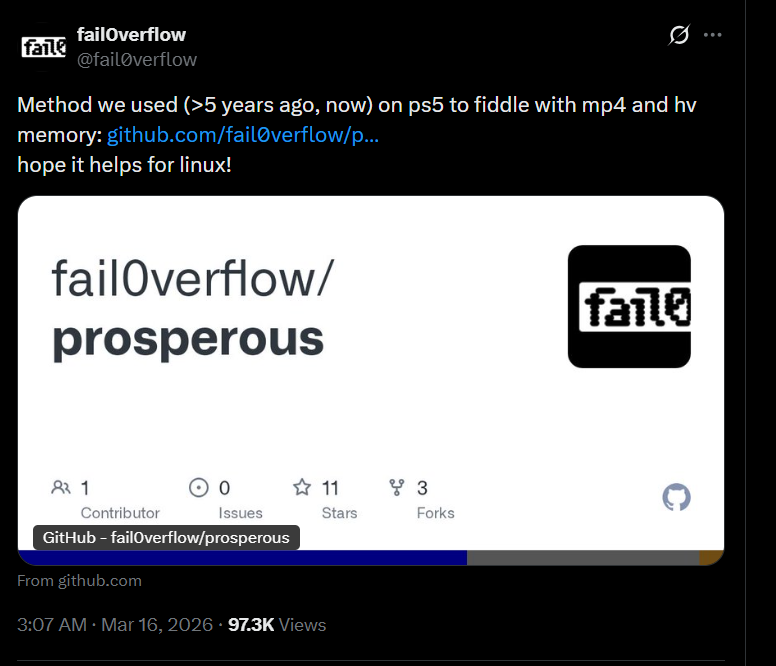 fail0verflow released the internal tool they used to mess with mp4 and hv memory on PS5.FlatZ also released his Hypervisor exploit for PS5https://www.logic-sunrise.com/forums/topic/108637-ps5-fail0verflow-fait-avancer-la-scene-ps5-encore-une-fois/https://x.com/fail0verflow/status/2033258726228939049