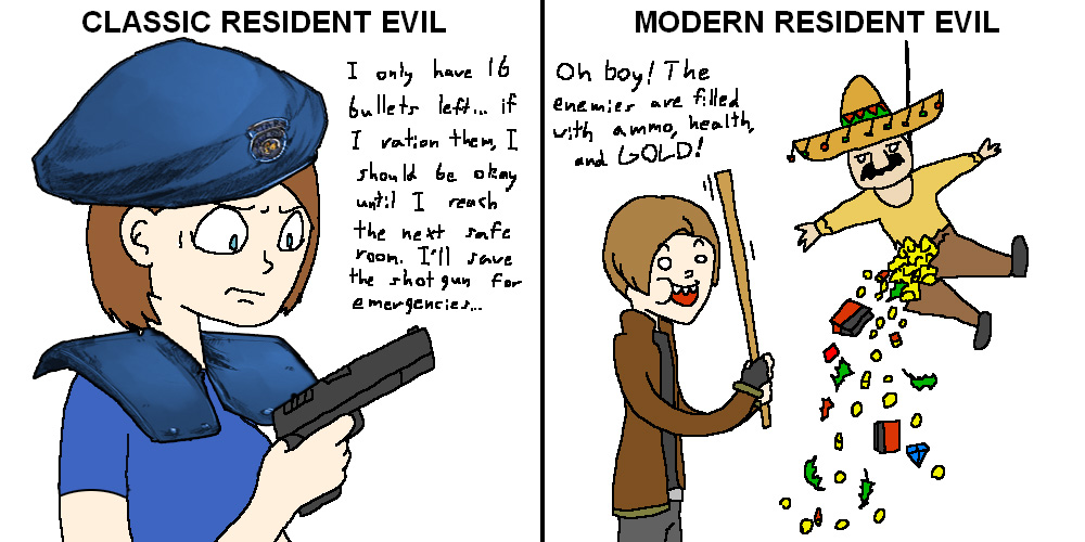 >>735161520>with surplus of loot. What is the problem exactly?>You want the game to be similar to the modern shit, where you barely get any ammo, and the bosses are hard-coded to die when you fire your last round ?Something like the matches mechanic from The Evil Within, you get a lot of ammo but enemies don't die until you set them aflame, though the majority of TEW is action.