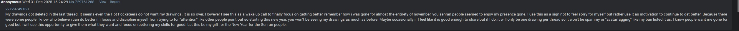 >>735181026Yeah he's been the resident schizo. As far as his art goes, that one is definitely one of the better ones. I hope he's taking the critique to heart. If people shat on me the way we shit on him I'd want to get better out of spite.