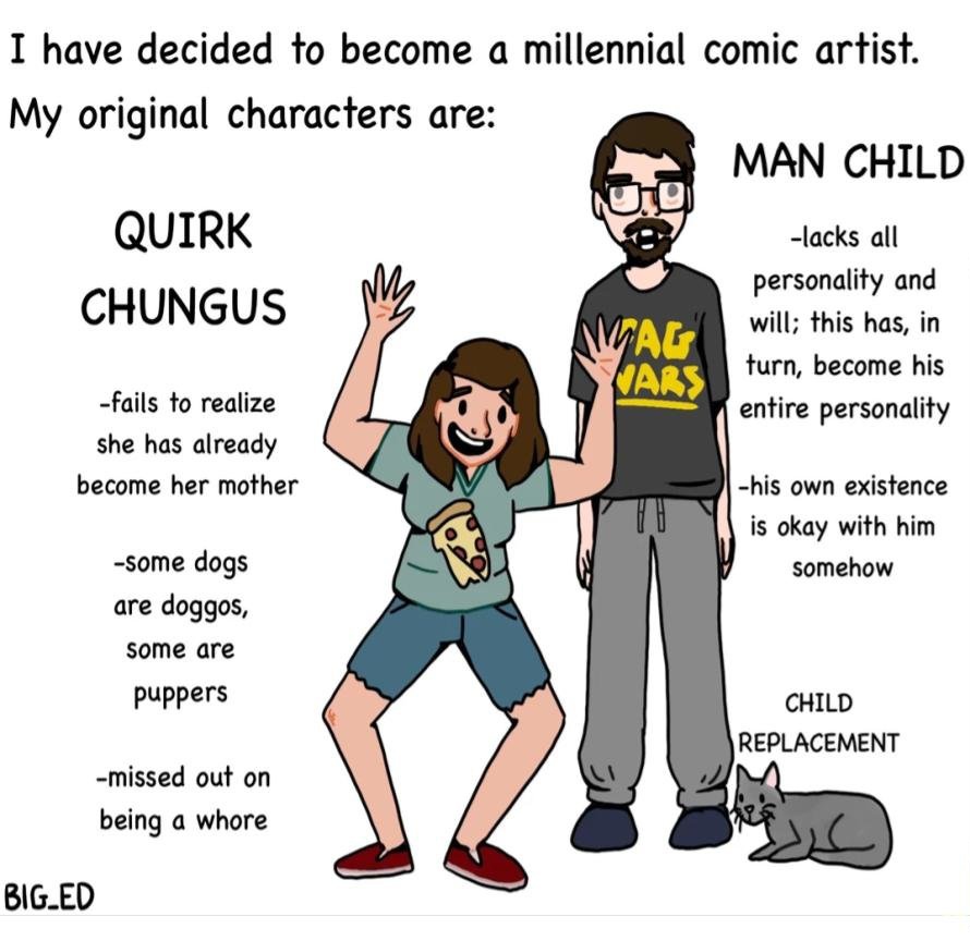 >>735162509this is an accurate portrayal of a millennial man, but it's really missing the woman who looks like Fiona from Shrek.