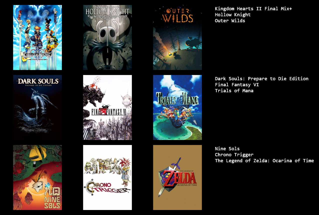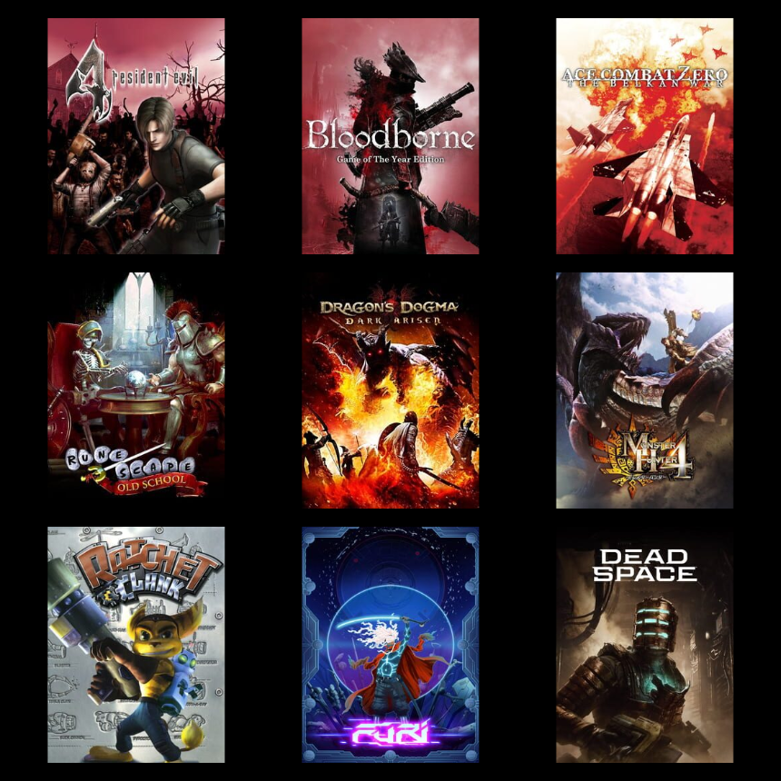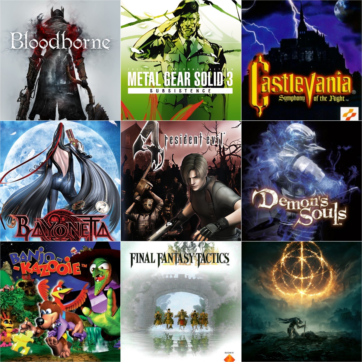 Here's a 9x9>>7351634044/7>>735163692I don't have the gall to put more than one fromsoft game 7/7>>735163821Never was much into shoot em ups1/5>>735163910still gotta play ape escape 6/7