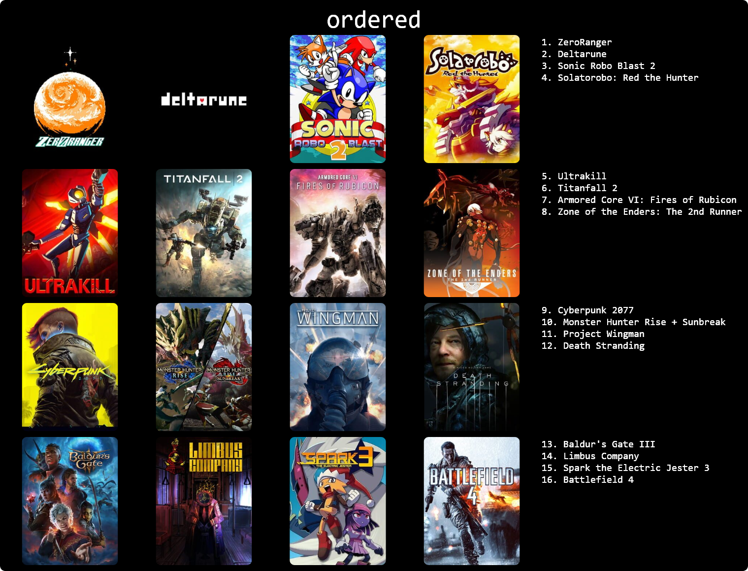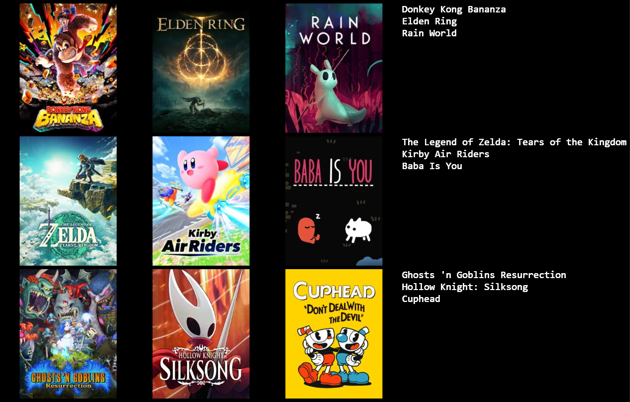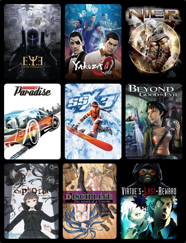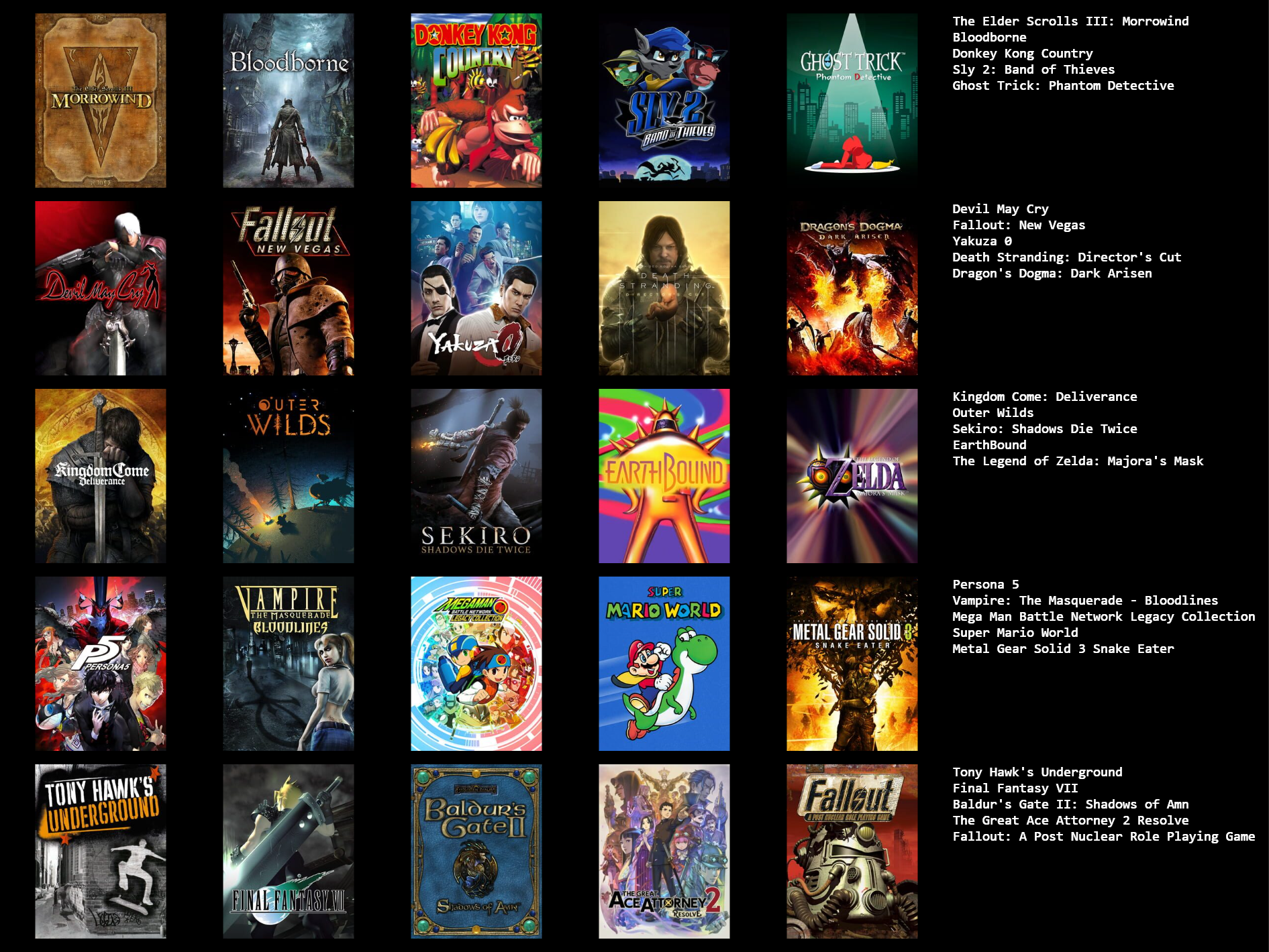 Here's a 9x9>>7351634044/7>>735163692I don't have the gall to put more than one fromsoft game 7/7>>735163821Never was much into shoot em ups1/5>>735163910still gotta play ape escape 6/7