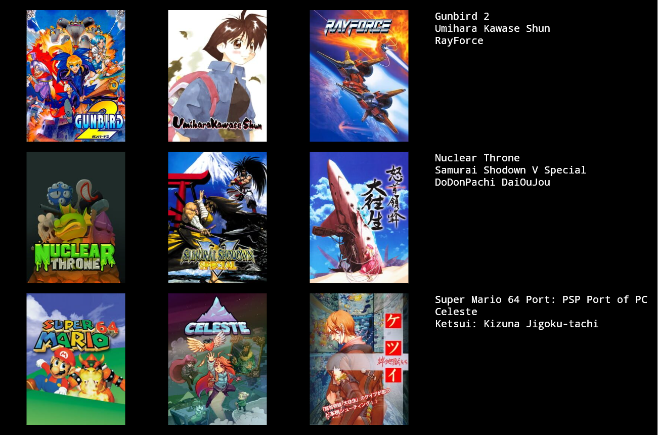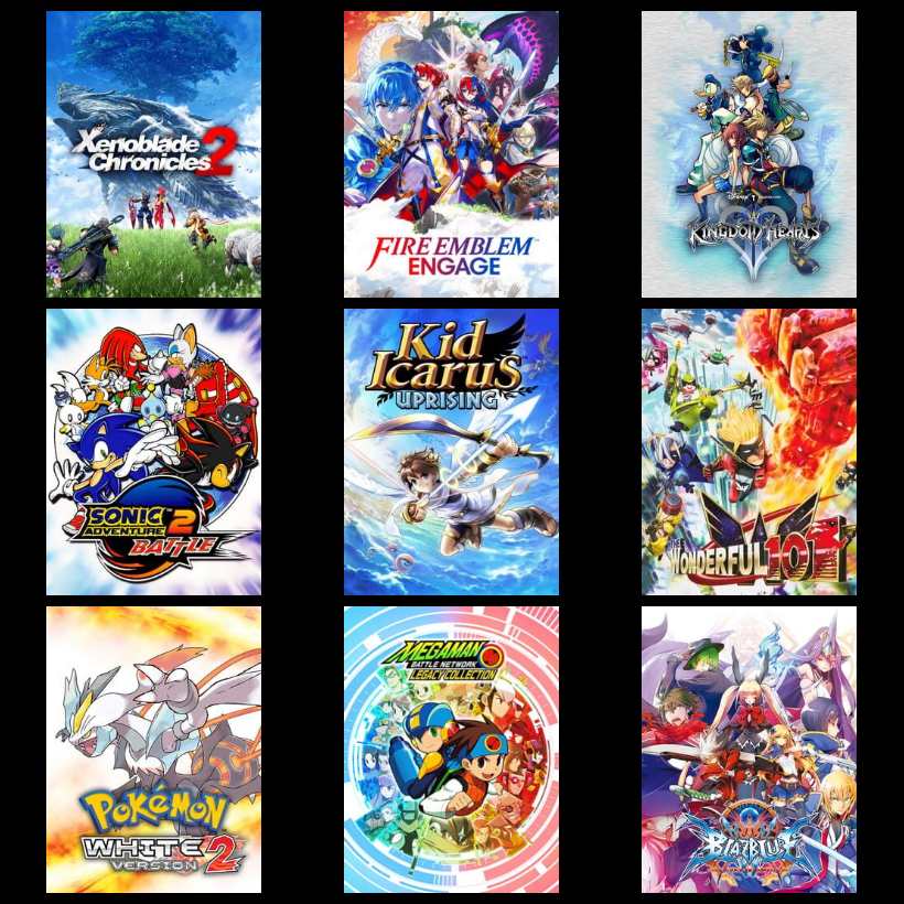 >>735163489what brings you here? >>735163704who cares bro, its fine to like things other people dont, I get told i have shit taste all the time other times I get good recommendations from here>>735163821whats the bottom right game like? gunbird seems pretty neat what I usually dont like about shmups is often times you just play as a ship >>735164406its interesting seeing someone with a 3x3 thats pretty much all newish games>>735165223>xenoblade 2, X, Conquest and maple story now this is epic