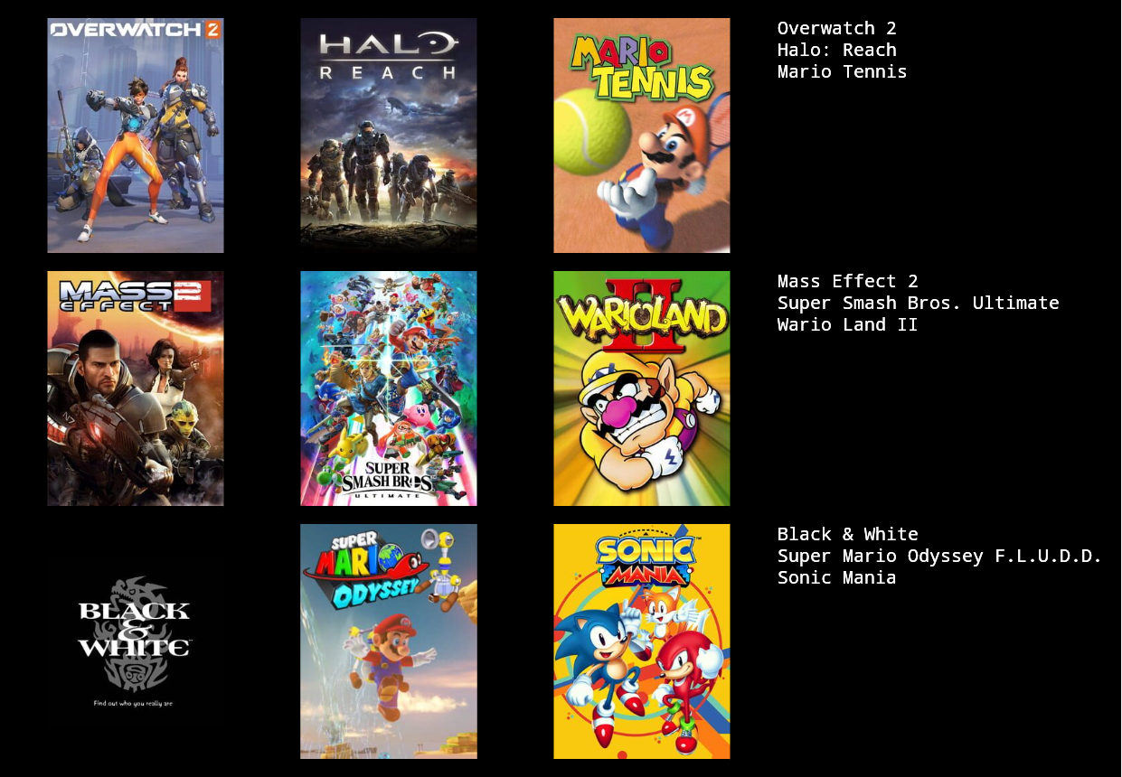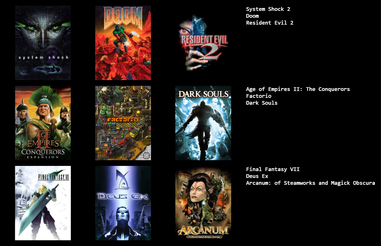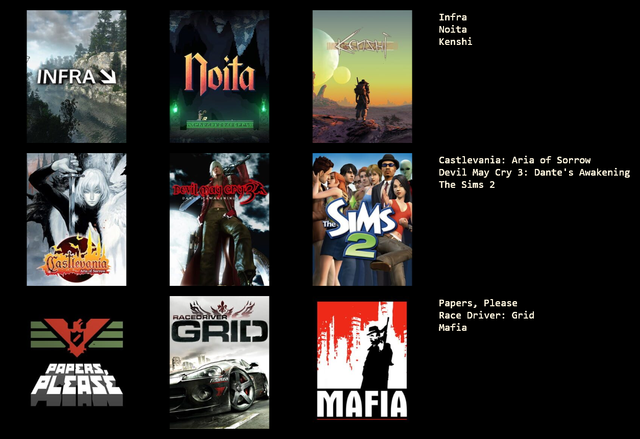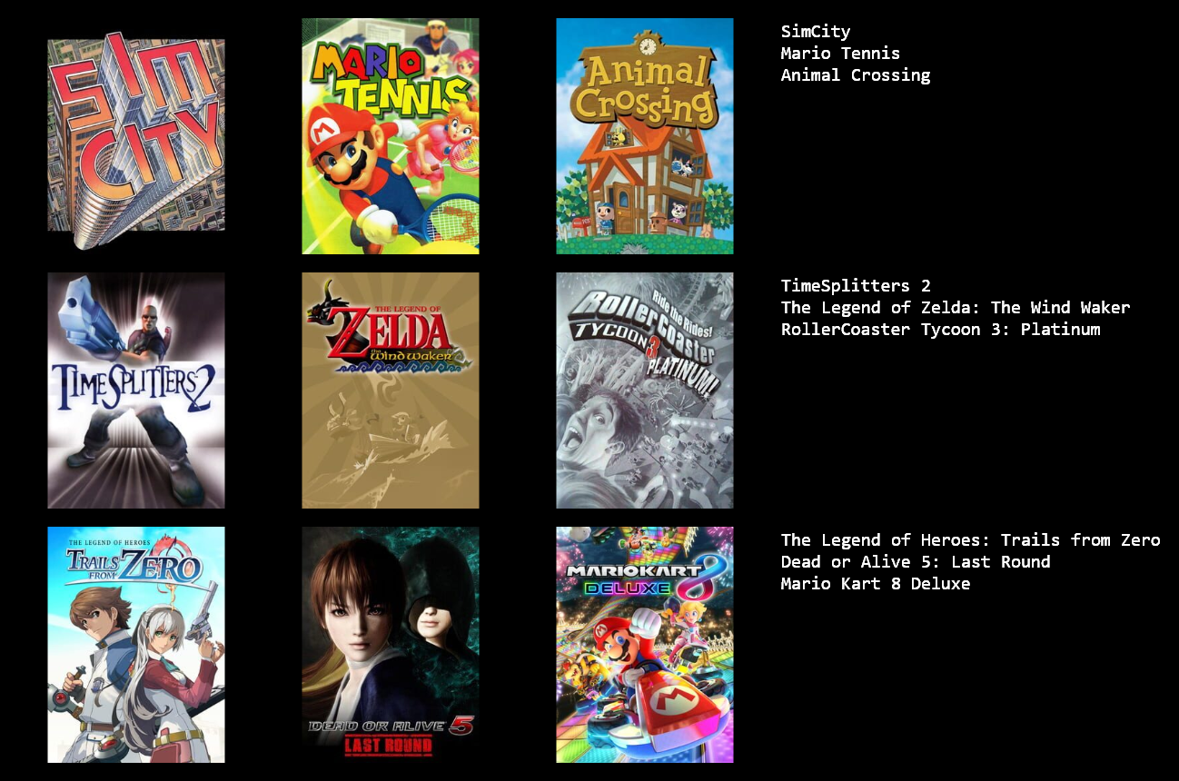These are the games I've mostly played over the last few months. I couldn't think of 3 more so you're stuck with a 3x2