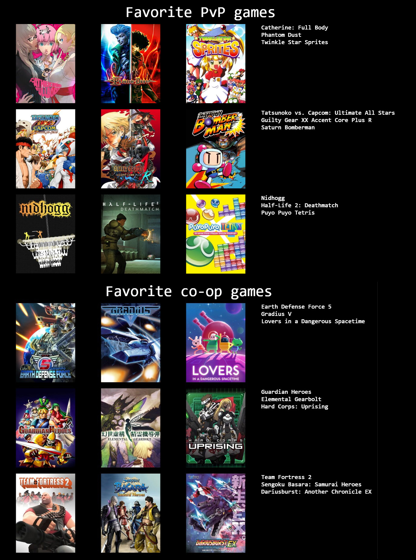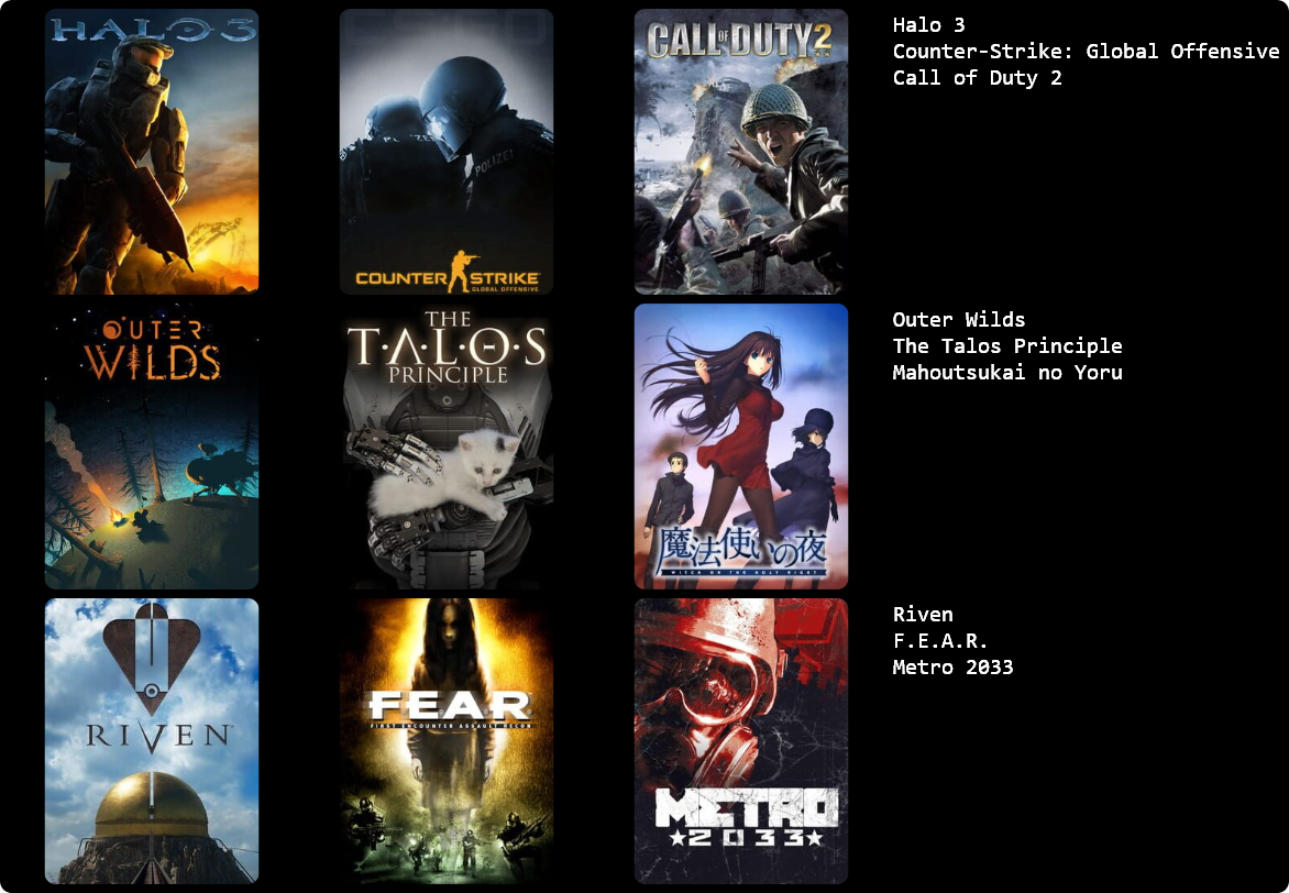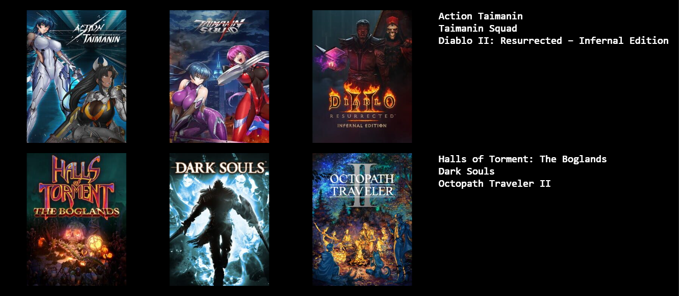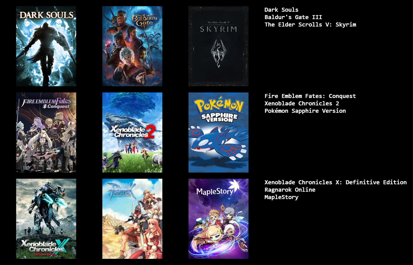 These are the games I've mostly played over the last few months. I couldn't think of 3 more so you're stuck with a 3x2