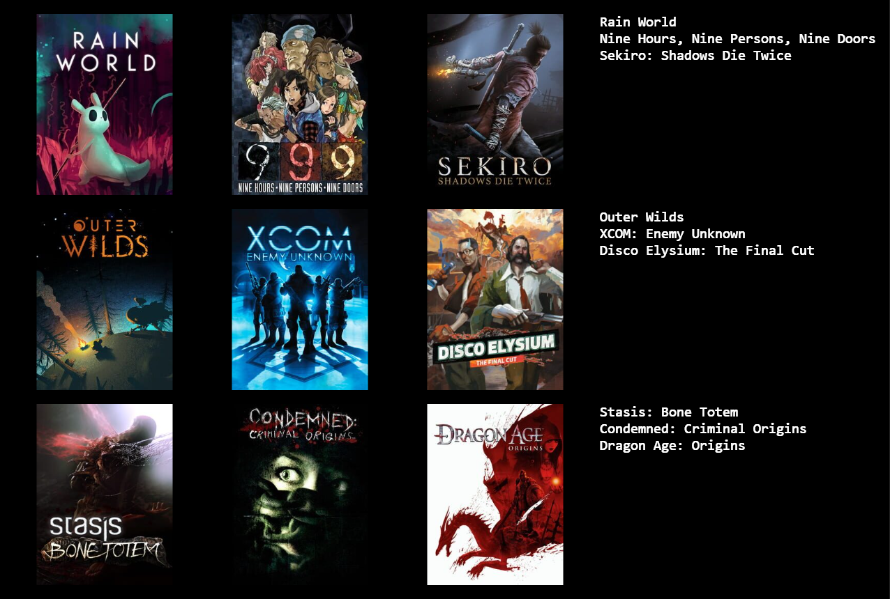>>735163404Thanks for labeling these clearly labeled games anon, I would not know which games you've picked for your totally unique and not normieNPC-core 3x3