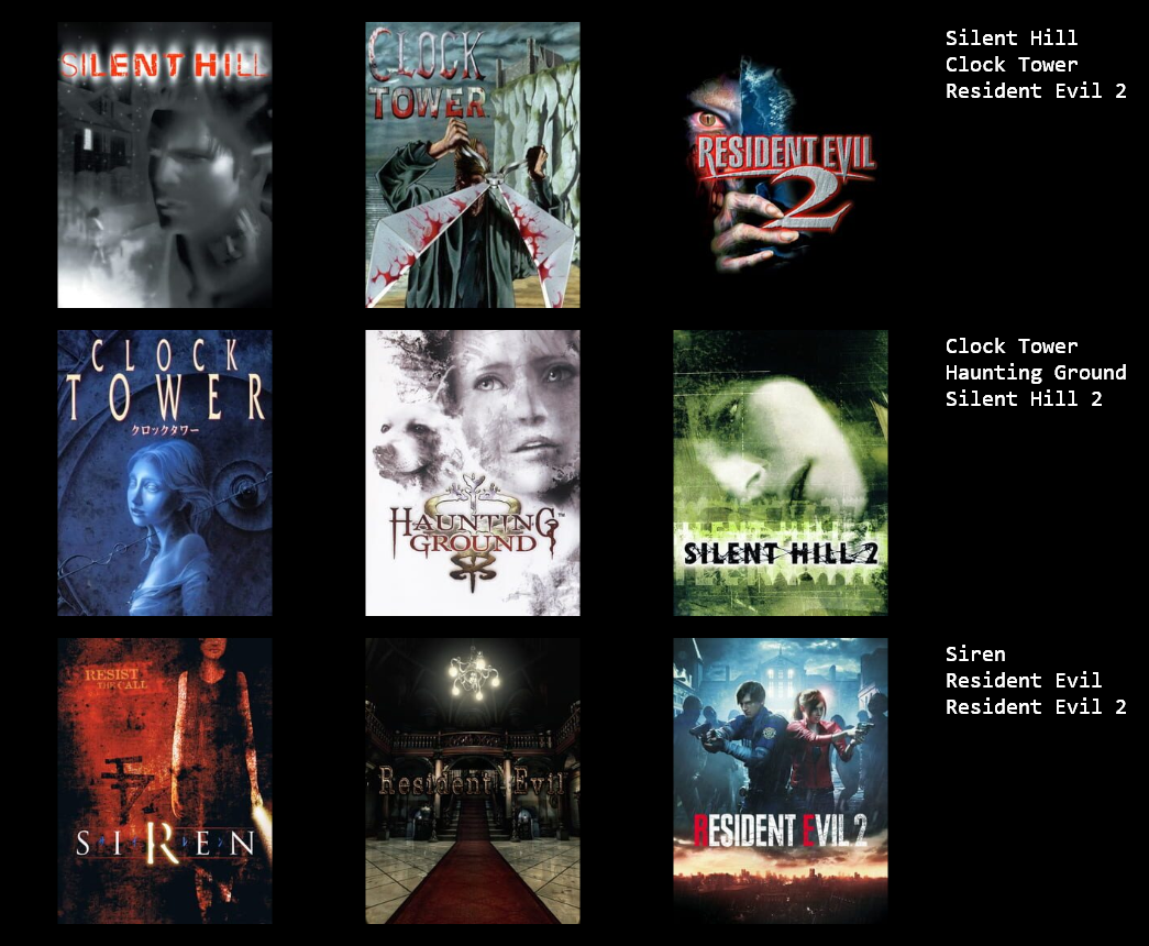 >>735169987I am not big survival horror guy. I only like RE4 for some reason.>>735169958Seems like PC gamer core. Didn't play a lot of these games growing up.>>735169814I like MH4, Dead Space and RE4 obviously. I enjoyed DD when I played it back when it came out but I have no idea if I would still like the game if I tried it now.