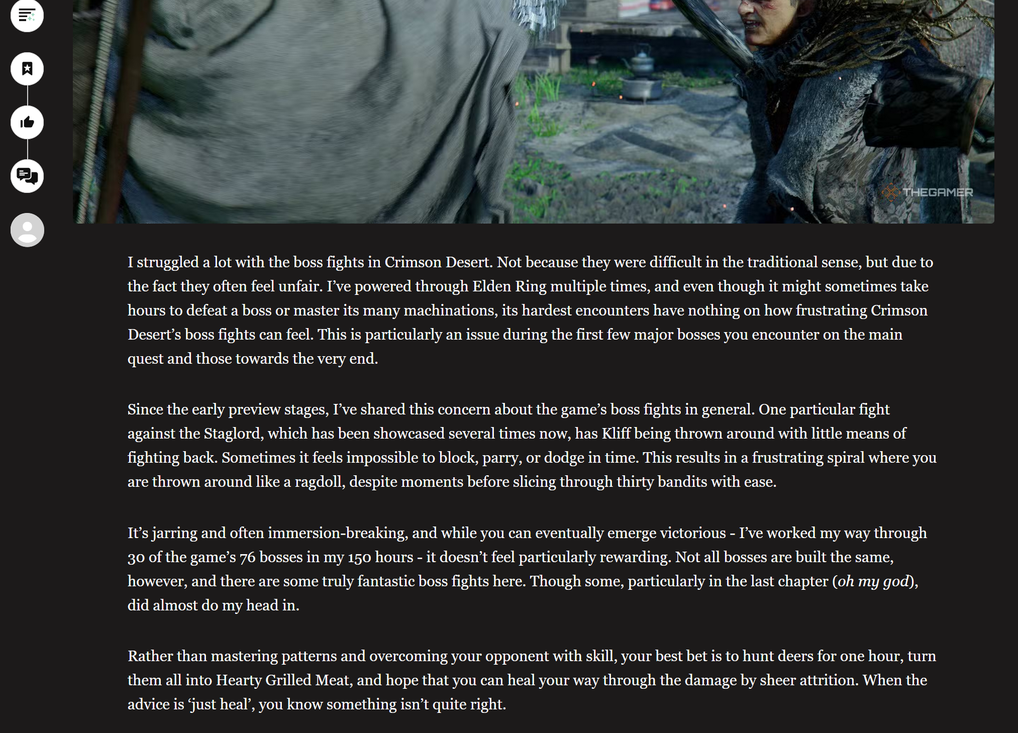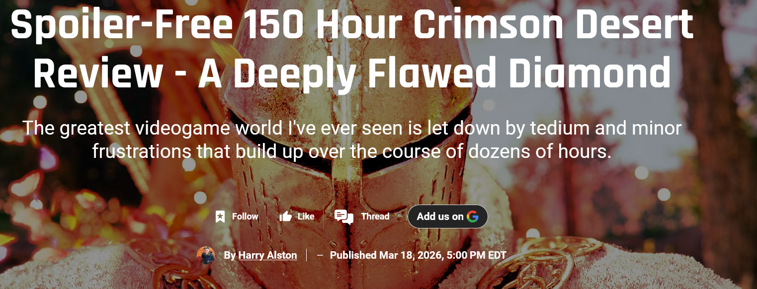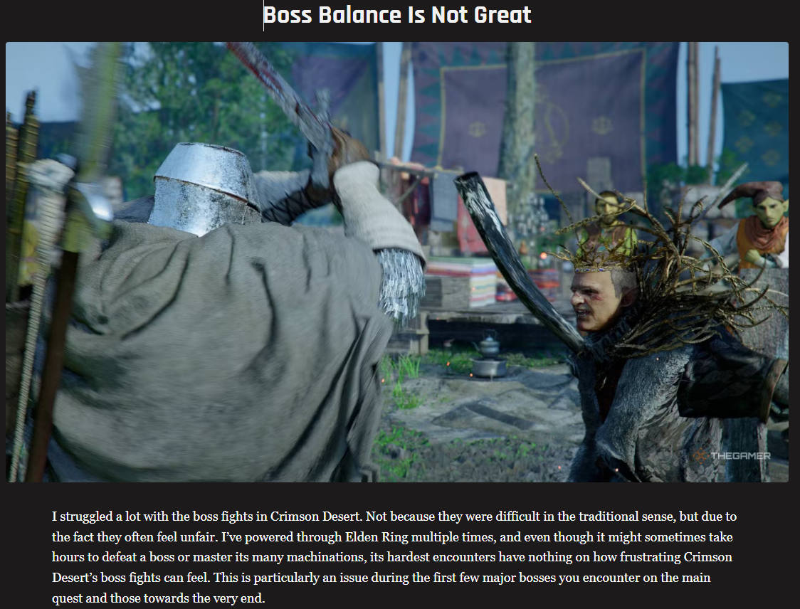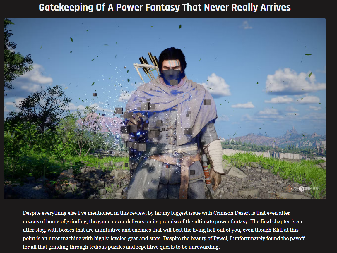 >Despite everything else I’ve mentioned in this review, by far my biggest issue with Crimson Desert is that even after dozens of hours of grinding, the game never delivers on its promise of the ultimate power fantasy. The final chapter is an utter slog,