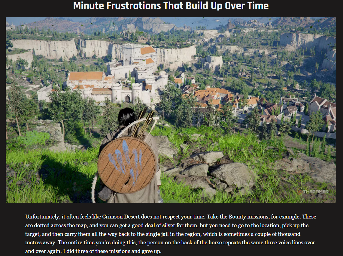 >Unfortunately, it often feels like Crimson Desert does not respect your time. Take the Bounty missions, for example. These are dotted across the map, and you can get a good deal of silver for them, but you need to go to the location, pick up the target, and then carry them all the way back to the single jail in the region, which is sometimes a couple of thousand metres away. The entire time you’re doing this, the person on the back of the horse repeats the same three voice lines over and over again. I did three of these missions and gave up.