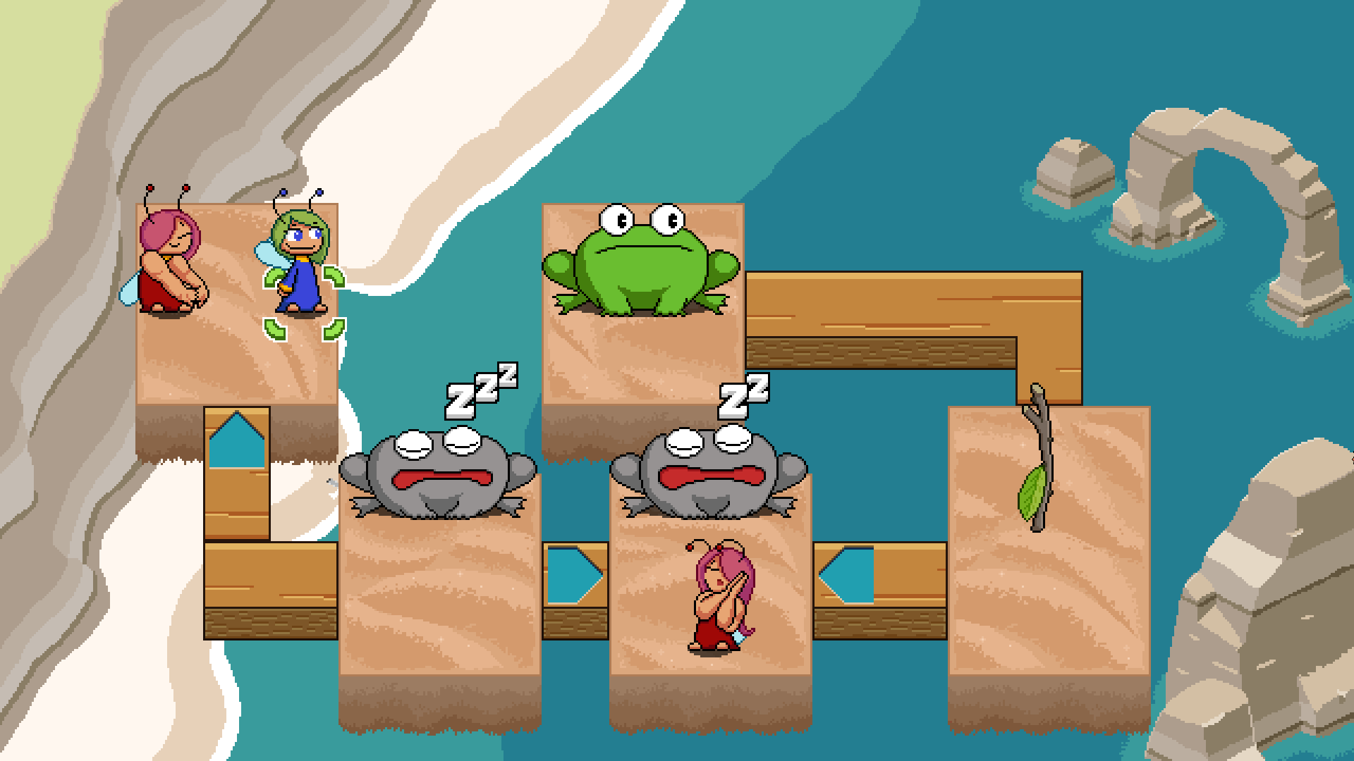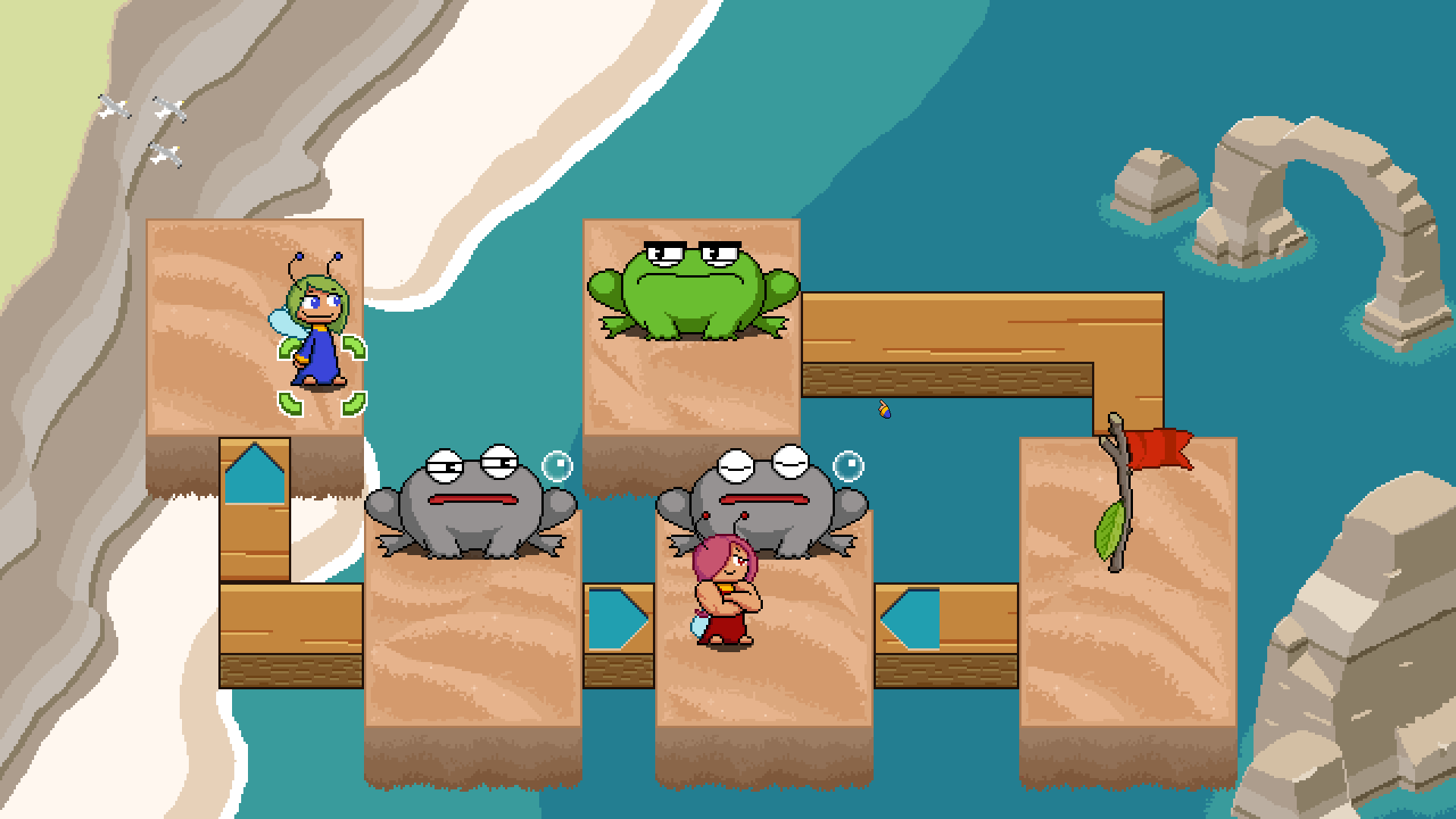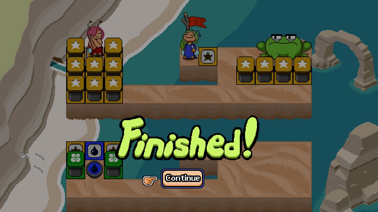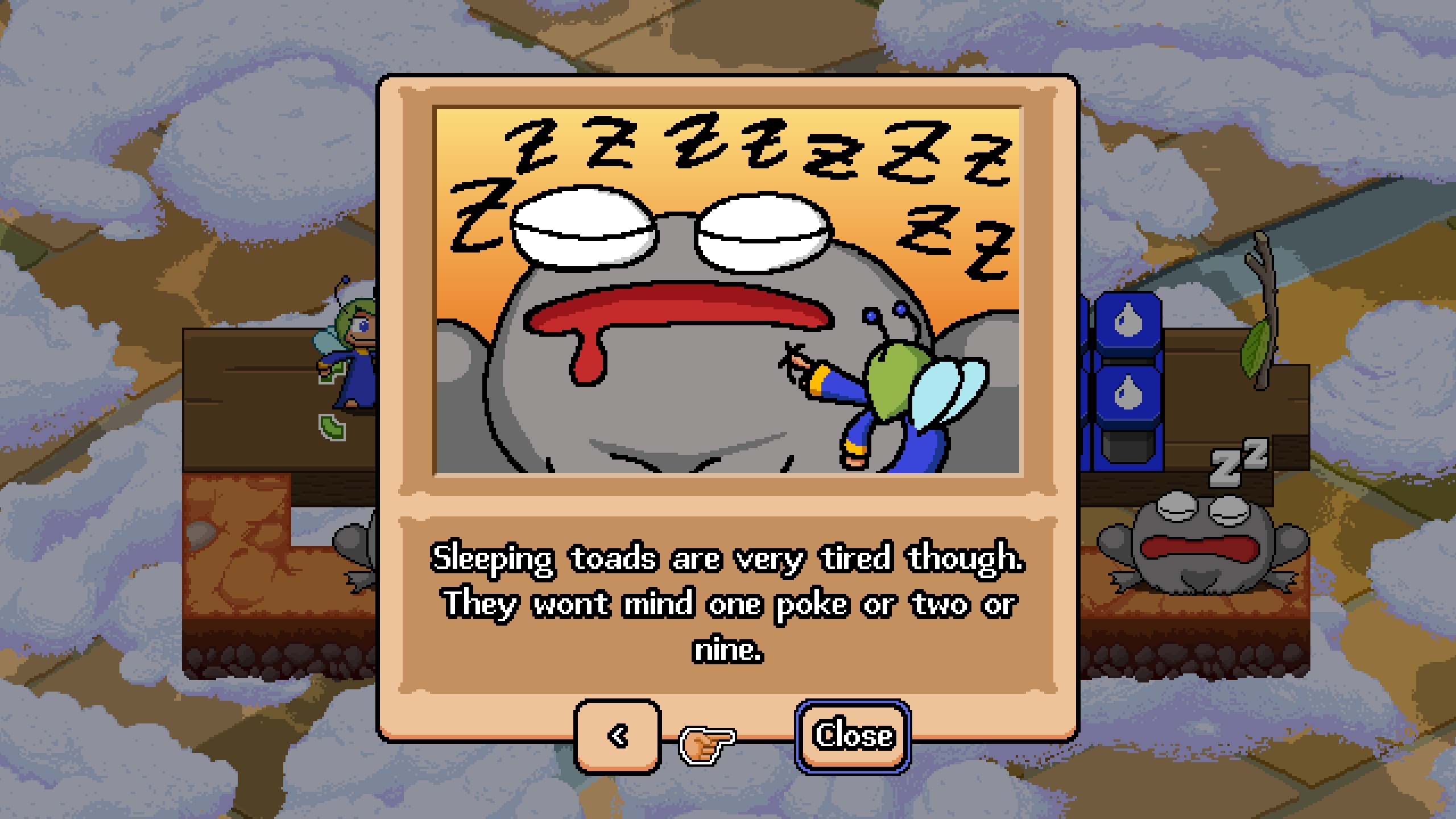 >>735337763It's a very 90s/AOL-Games-esque puzzle game with cute pixel art. You control fairies who have different quirks and abilities and the goal of the levels is to poke all the toads and then get to the goal whilst avoiding having your main fairy (who is the only one that can poke or activate the goal) being eaten by the toads (who get pissed off after you poke them).