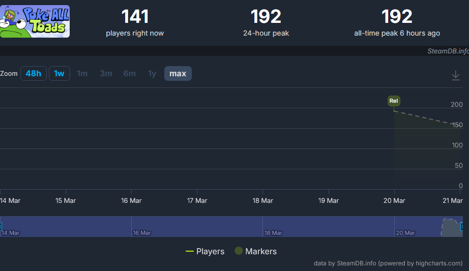 You'd think the game to be massively popular with all the activity in this thread but then you look at the metrics and.. kekI've seen games in the 20k+ player count with slower threads. The marketing discord cohort for poke all toads is working overtime, looks like.