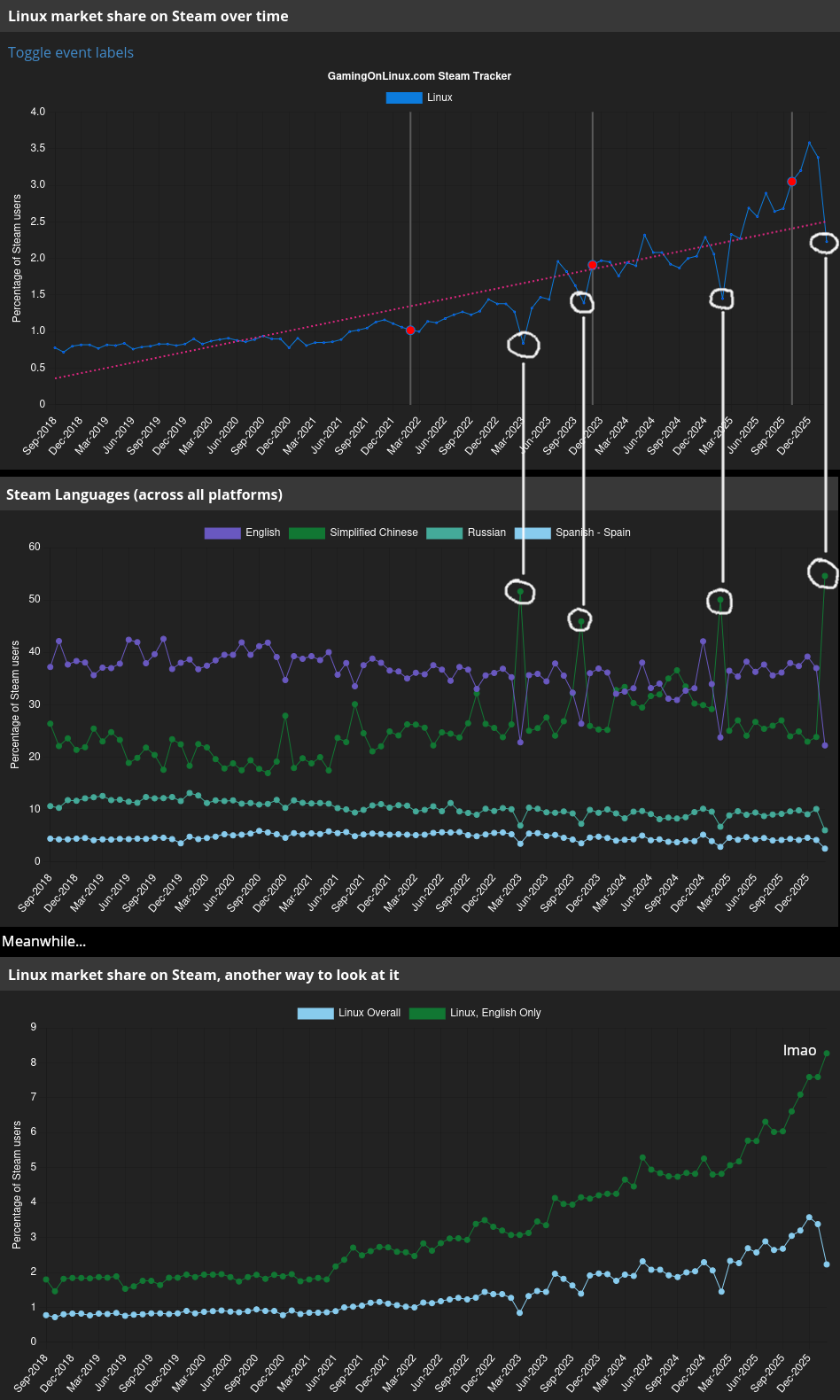 >>735381839Already happened, latest hardware survey shows Windows is gaining again, and not by a small amount either. Retards seethed at MS for fucking up 11, went "fuck you I won't switch from 10 to 11, I'll move to Linux!", and after a month or so they quietly switched to 11.