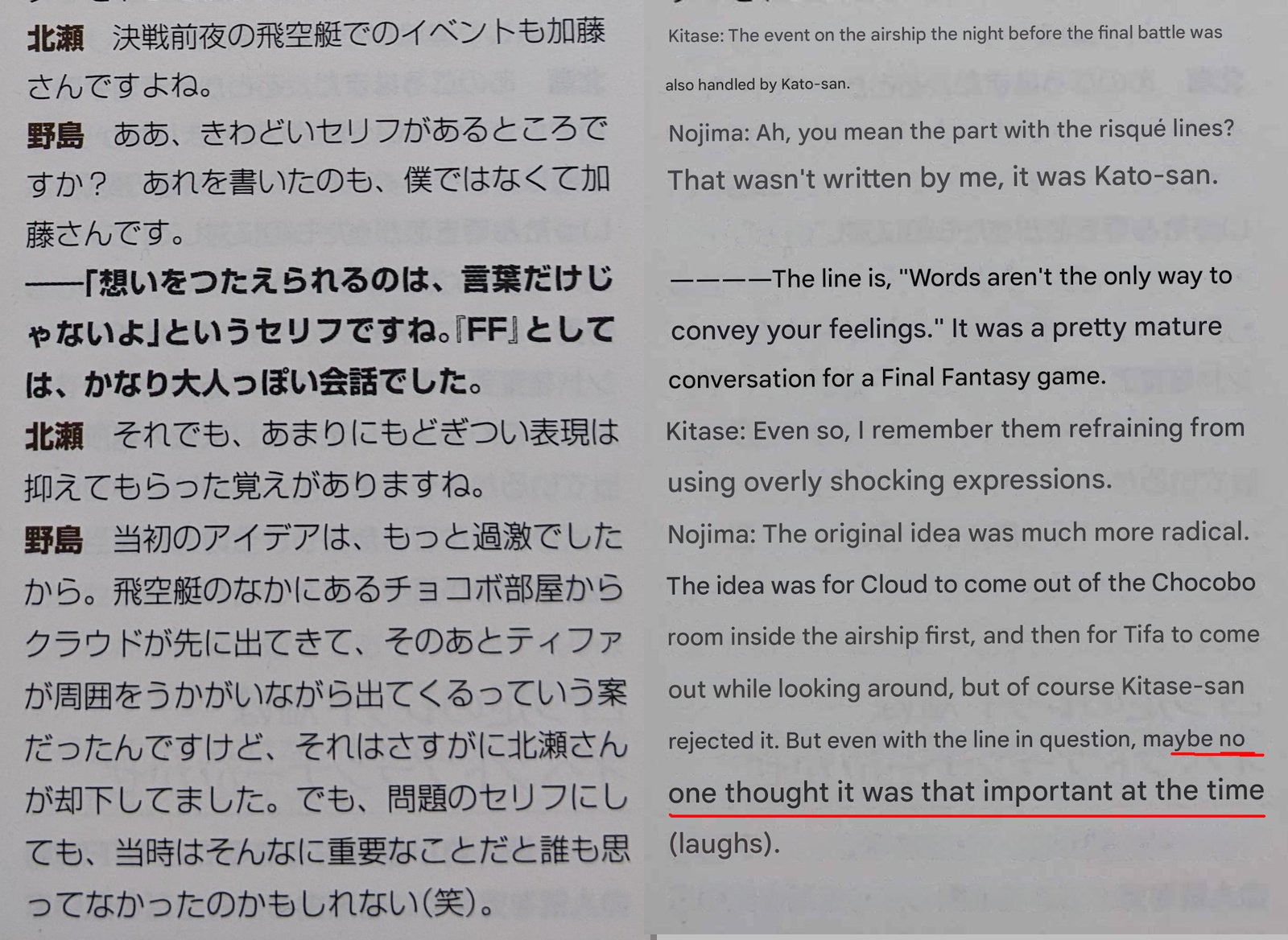 >>735447476Kato proposed the scene, nojima was open to the possibility, but kitase, the director, shot it down