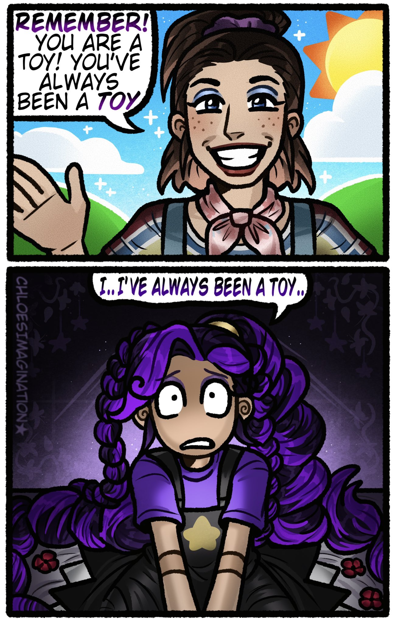 >>735580026The conditioning did work though. Many of the toys don't even remember that they were human. The only one who has referenced his parents is Doey.>>735582017Also when he did condition her, there were no other humans around, just toys. That probably made it easier for her to just accept that toys were the only thing in this world.