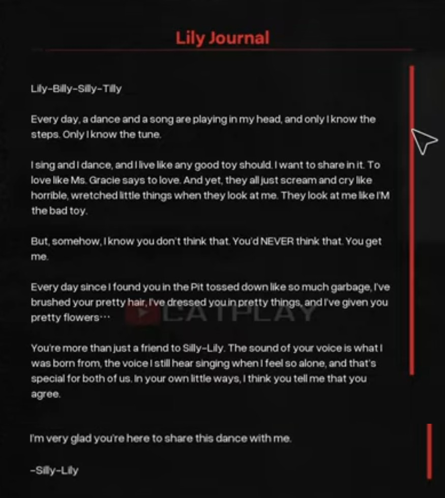 >The toys think Gracie died in The Hour of Joy>The Prototype secretly took her and did all the stuff he did to Lily, purely for his own research>So the toys have no idea who Lily is>During the game she's just one of The Prototype's toys>The Player discovers and reveals that she is Gracie, a massive shock to everyone in the factory>Now the toys turn on Lily but she doesn't understand why>Gives The Player a choice, do they leave her to her fate, or do they save her?