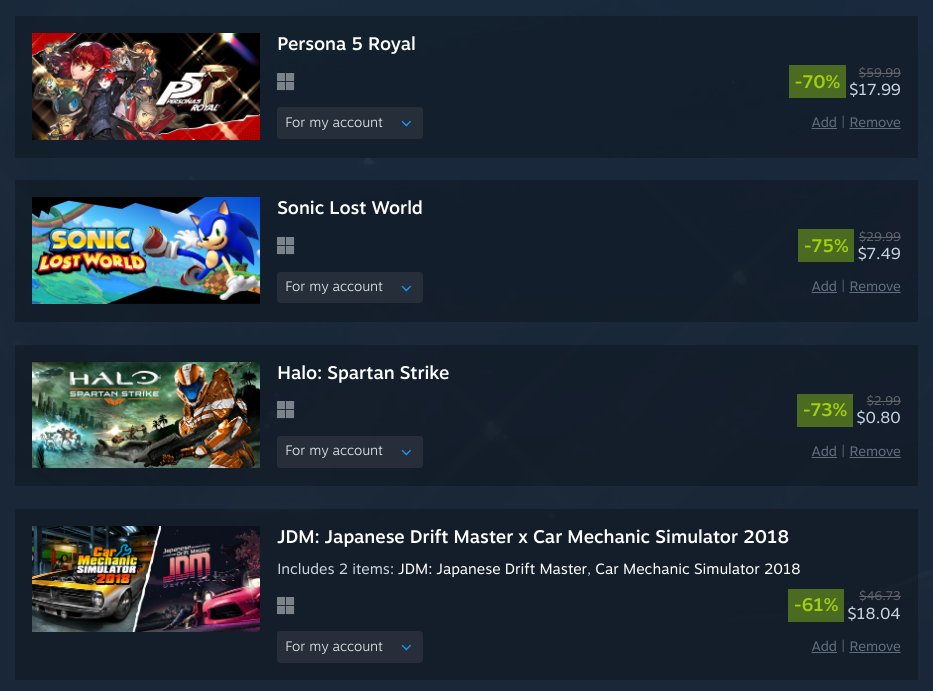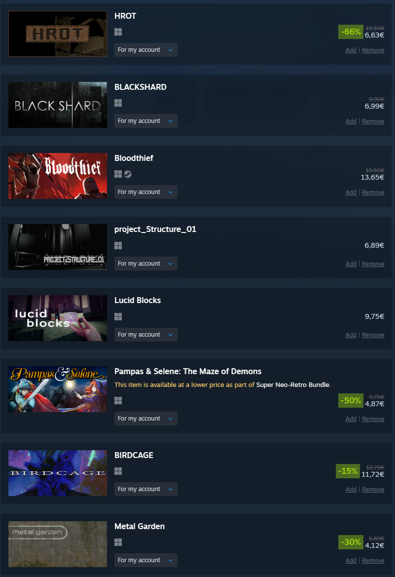So far I have my sights on:AI War 2Assetto Corsa EVOAssetto Corsa RallyCall of Duty Modern Warfare 2019Deep Rock GalacticFactorioForza Horizon 6Grim DawnHelldivers 2Intravenous 2KenshiPalworldPortal bundleSMT 5 VengeanceSynthetik 2System Shock remasterTainted GrailQuasimorphAny suggestions/recommendations?