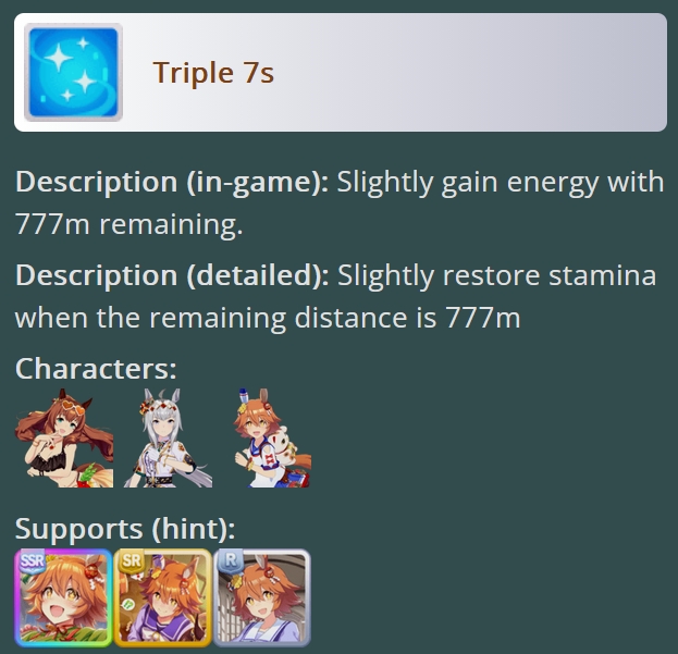 >>735534835if you're really set on gutsmaxing drop either kita or windy and run another guts card, you want to hit as close as 1200 guts as you can, that setup spurts 60% of the time but increases to 72.5% with 1000 guts and 78 with 1100use a small breather as your activator, 777 triggers waaay to late