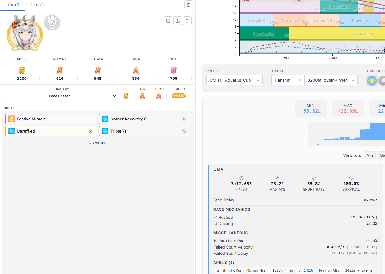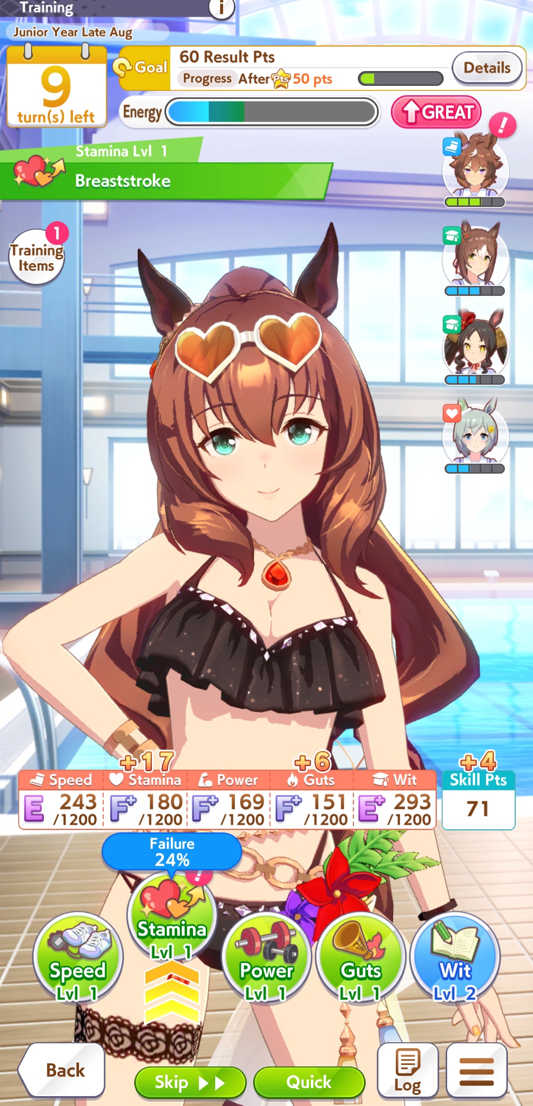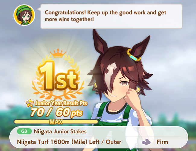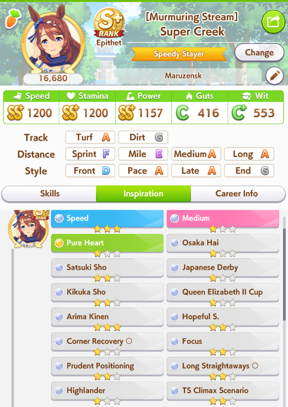 On the subject of Xoguri, I could really use some help. I keep WAY overshooting speed while not getting quite enough stats everywhere else. My parent sparks are all stam aside from 2 power, so I've been messing with my deck trying to balance it (I fucked up and borrowed Bijin instead of Ayabe for this run though) Should I try dropping a guts for another power?Also, is three white + 1 gold enough recovery for her as a late on this cm?